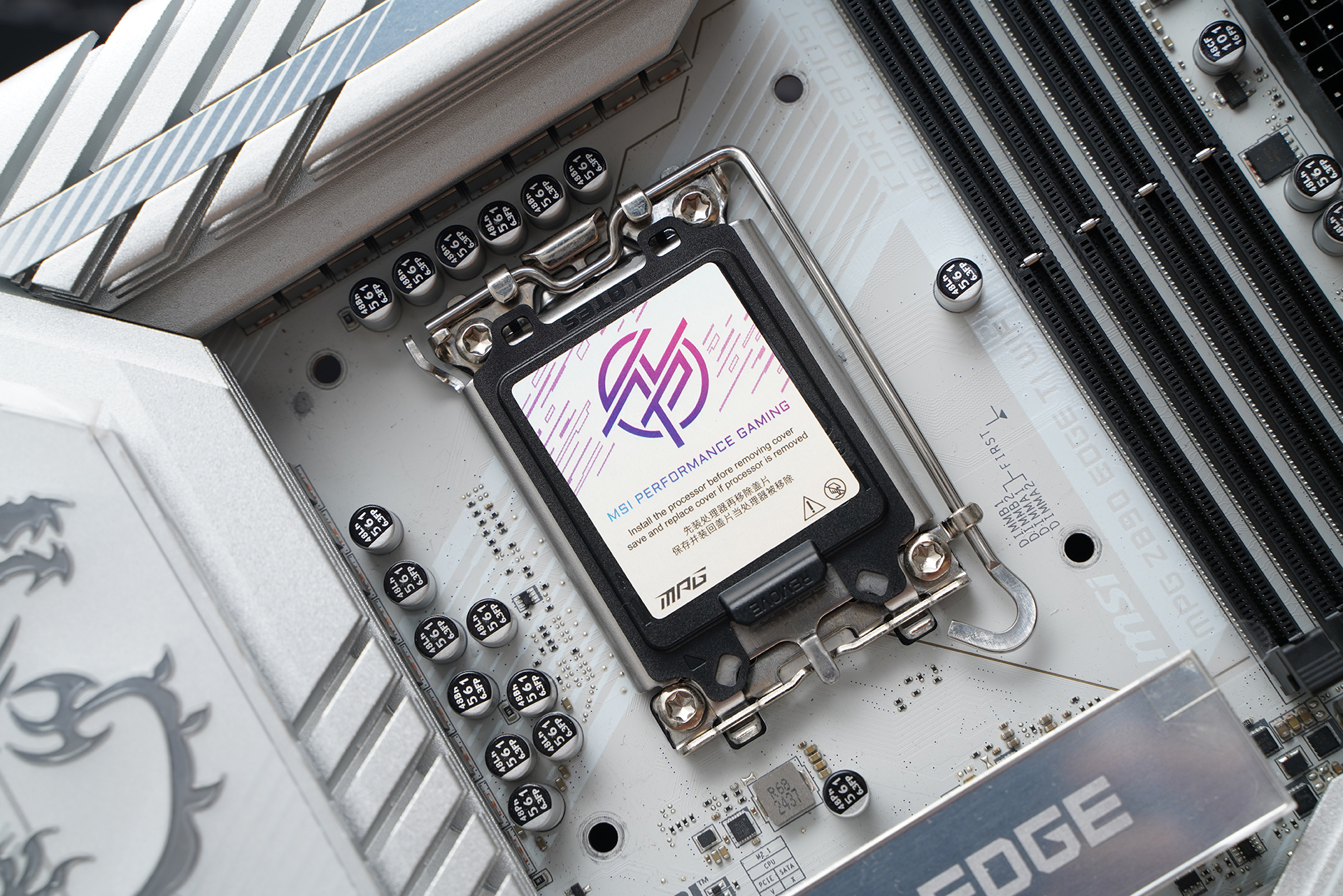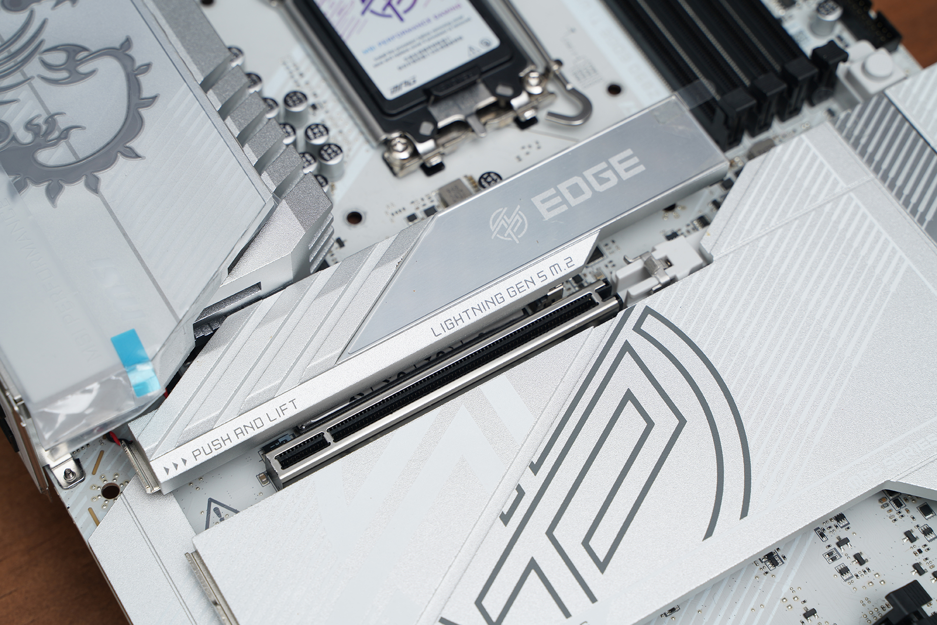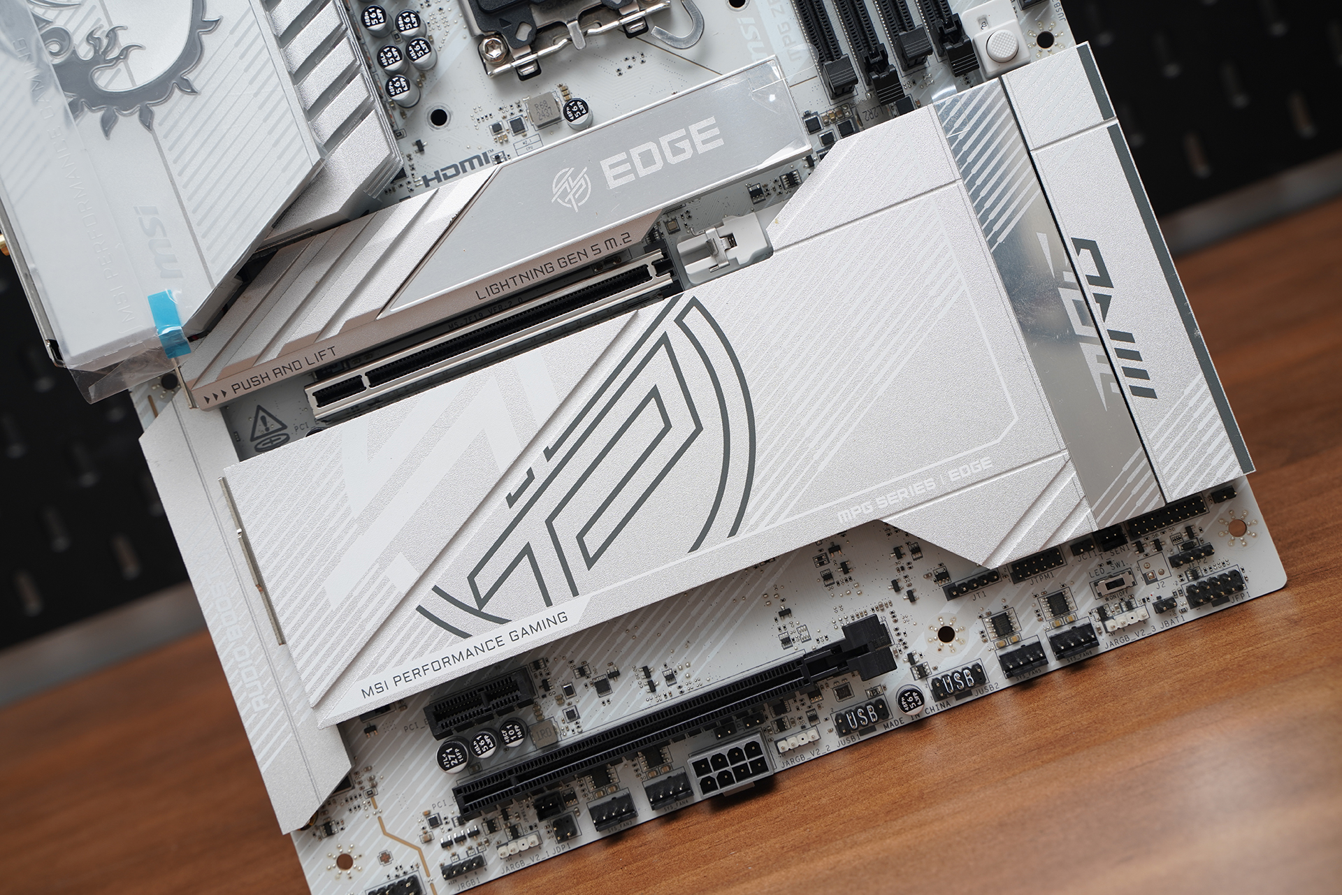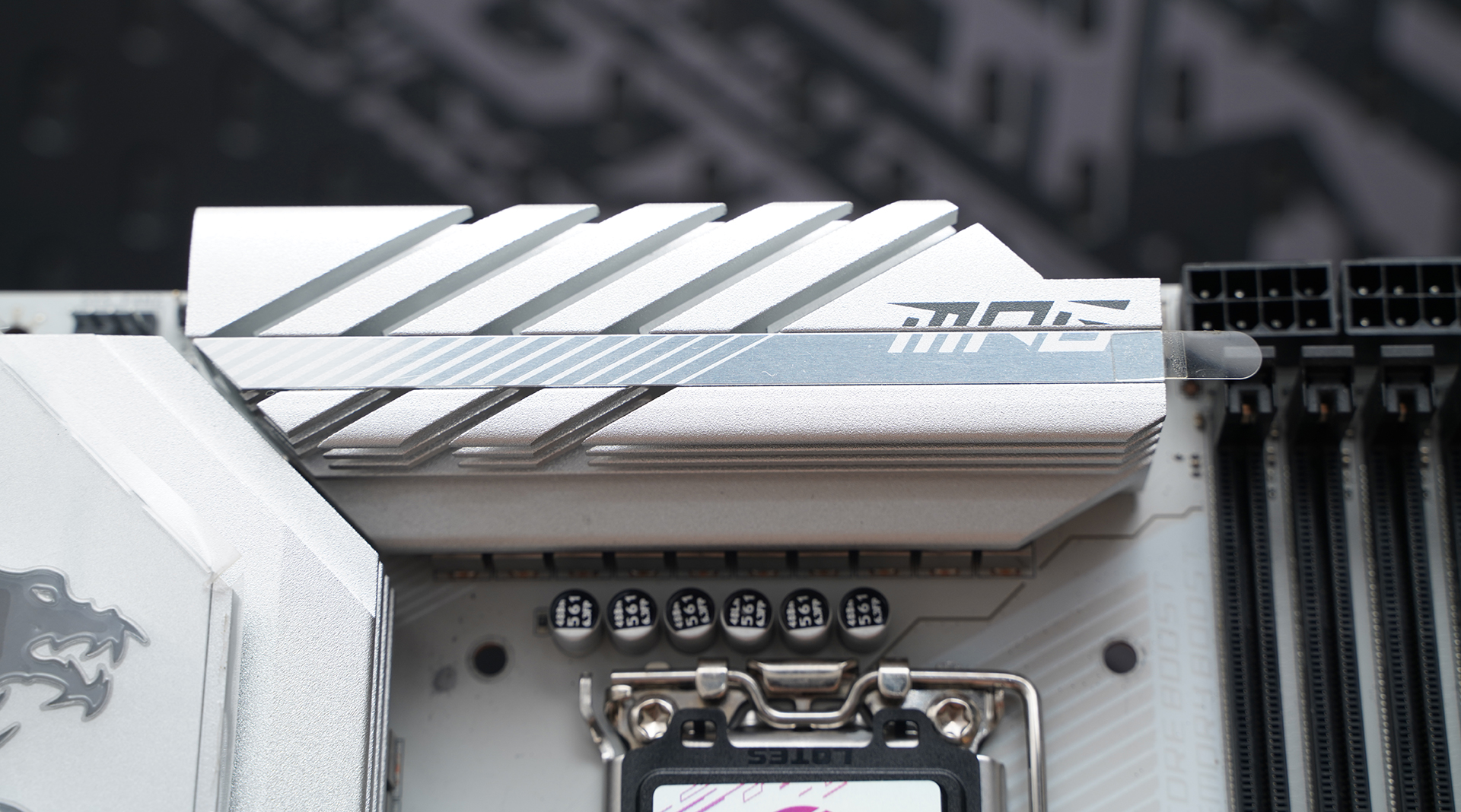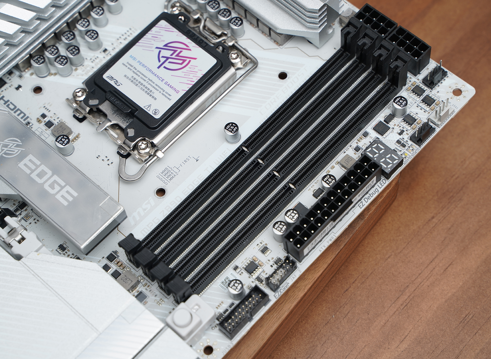产品采用标准ATX板型,MSI MPG Z890 EDGE TI WIFI延续刀锋钛系列的高辨识度白色主题设计,大面积银白装甲覆盖,从供电散热到M.2区域形成统一视觉语言。VRM散热片采用层叠切割造型,配合拉丝与线条元素,质感偏金属工业风,同时又不会过于张扬。
