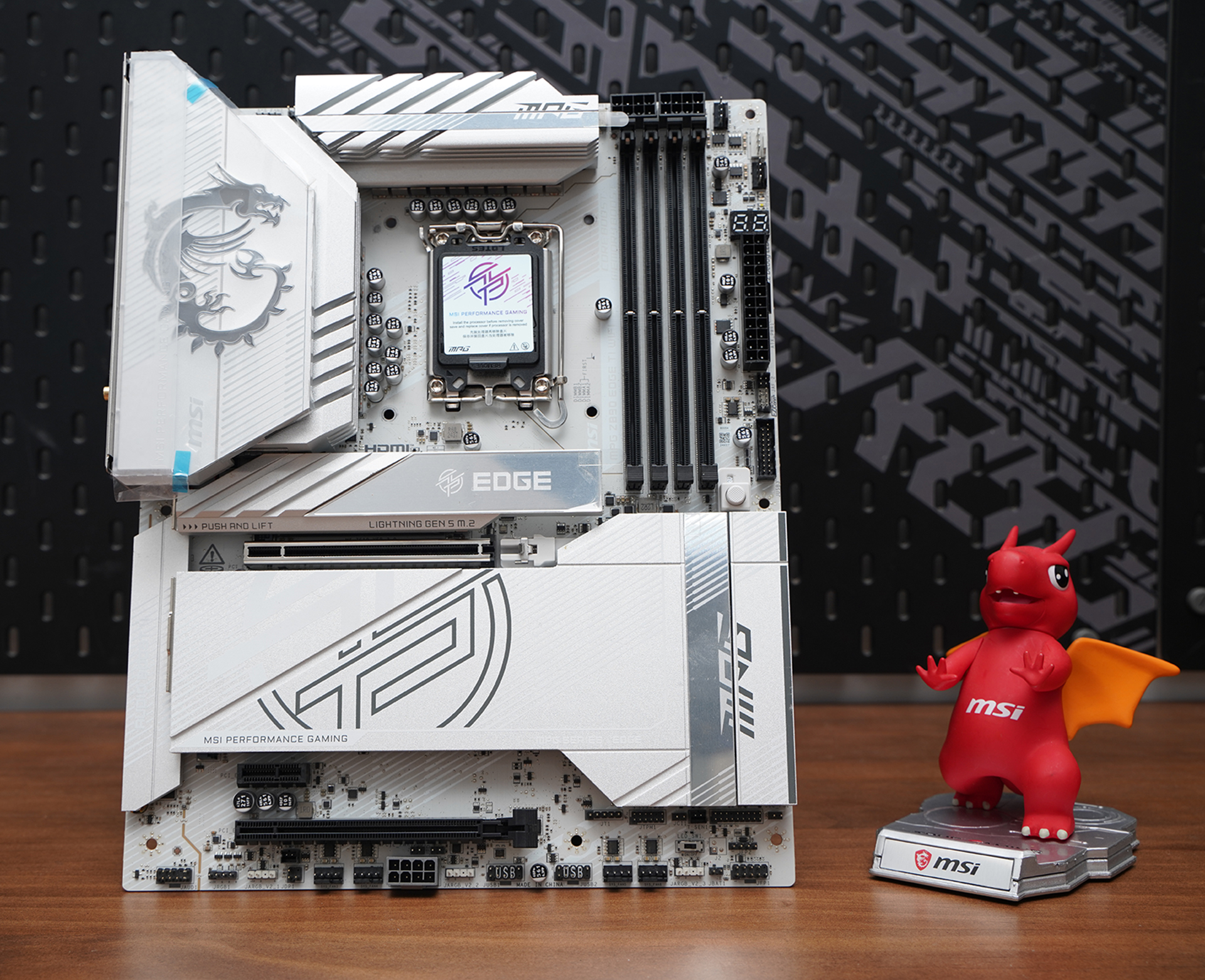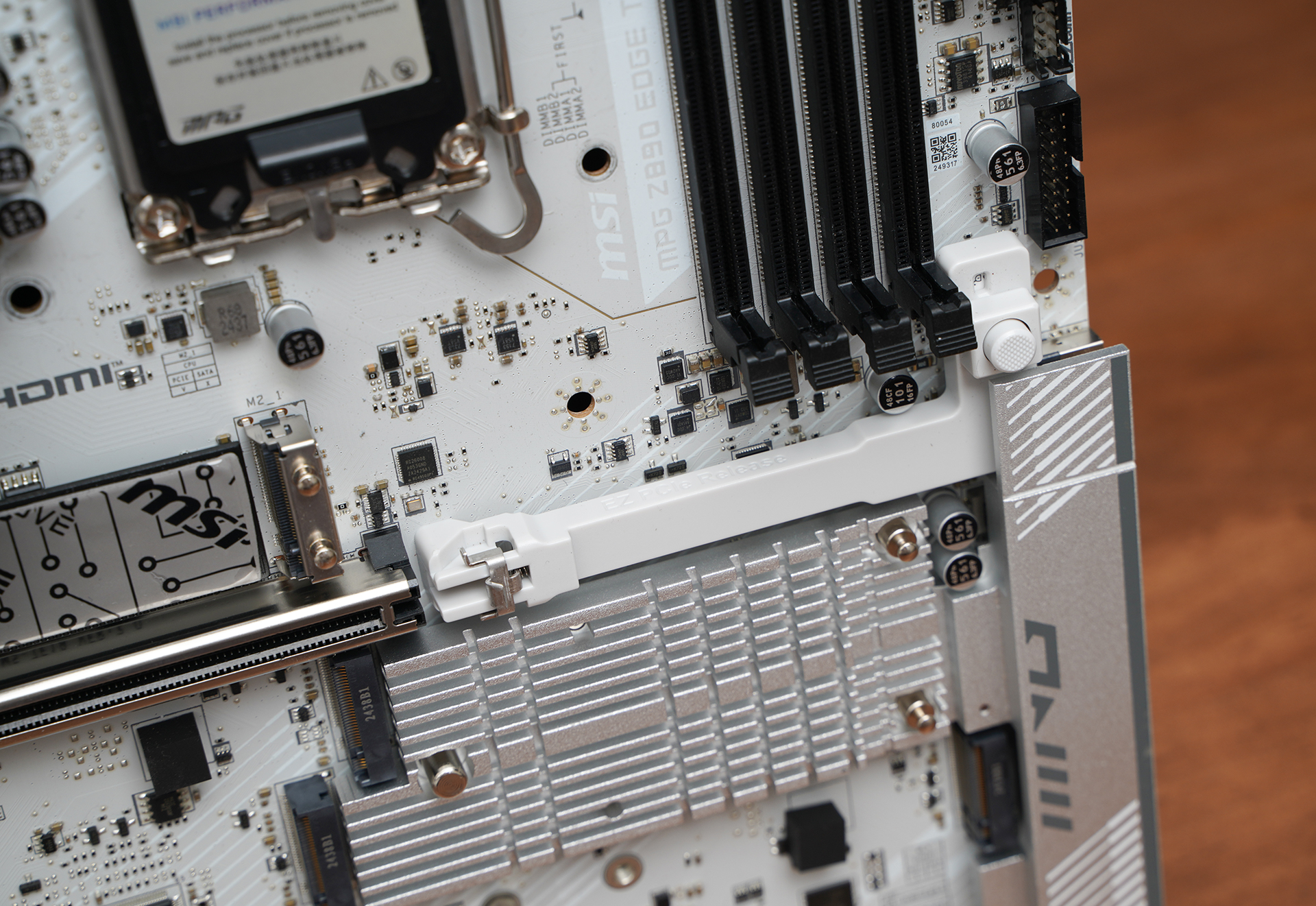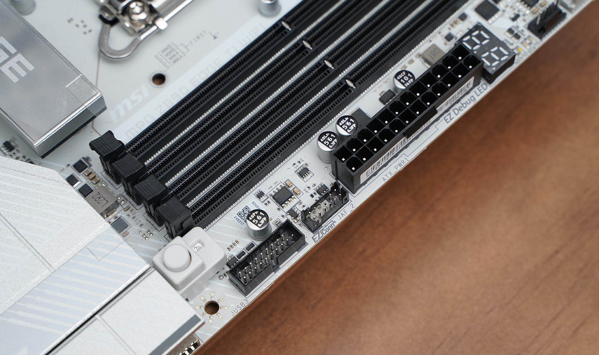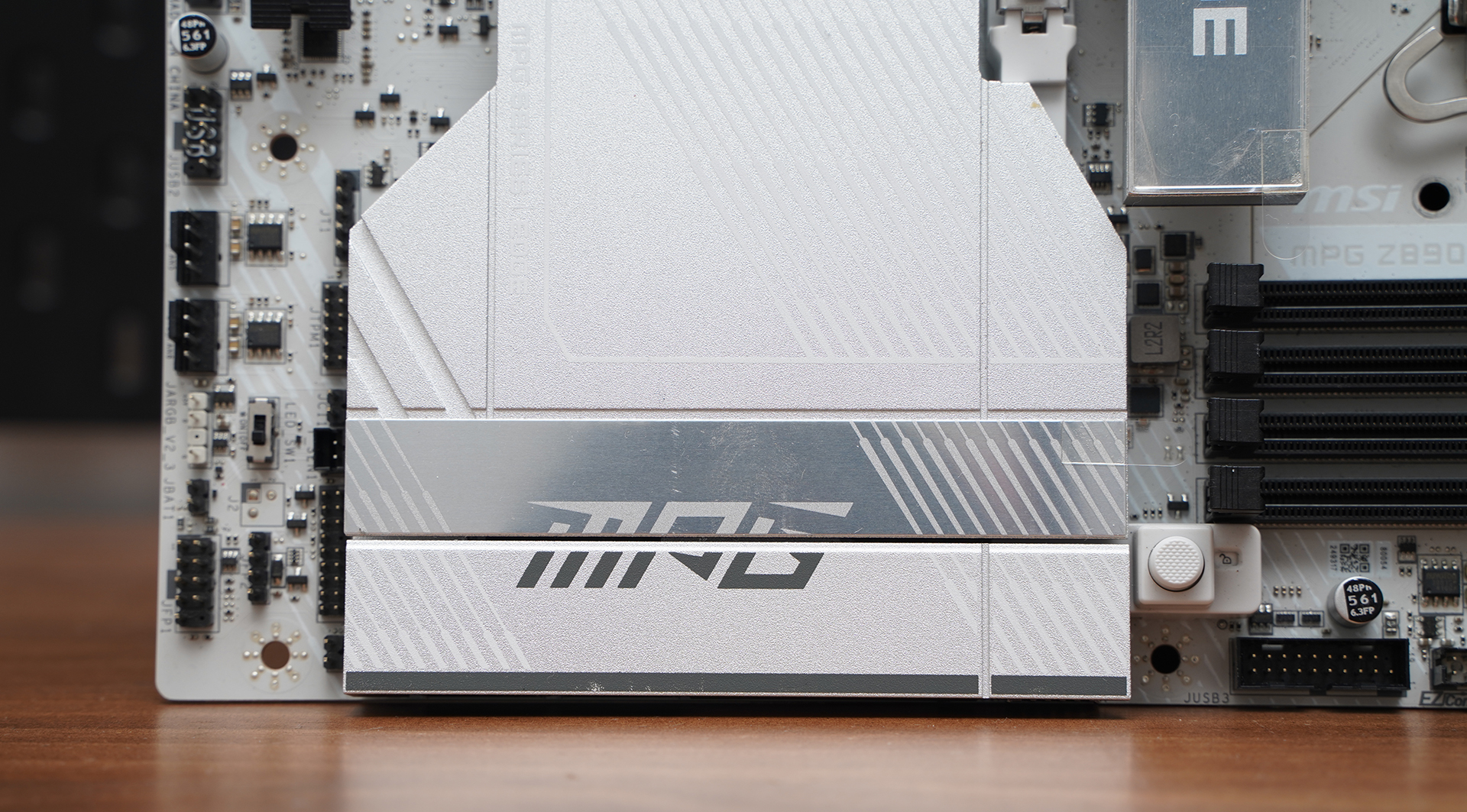 产品采用标准ATX板型,MSI MPG Z890 EDGE TI WIFI延续刀锋钛系列的高辨识度白色主题设计,大面积银白装甲覆盖,从供电散热到M.2区域形成统一视觉语言。VRM散热片采用层叠切割造型,配合拉丝与线条元素,质感偏金属工业风,同时又不会过于张扬。