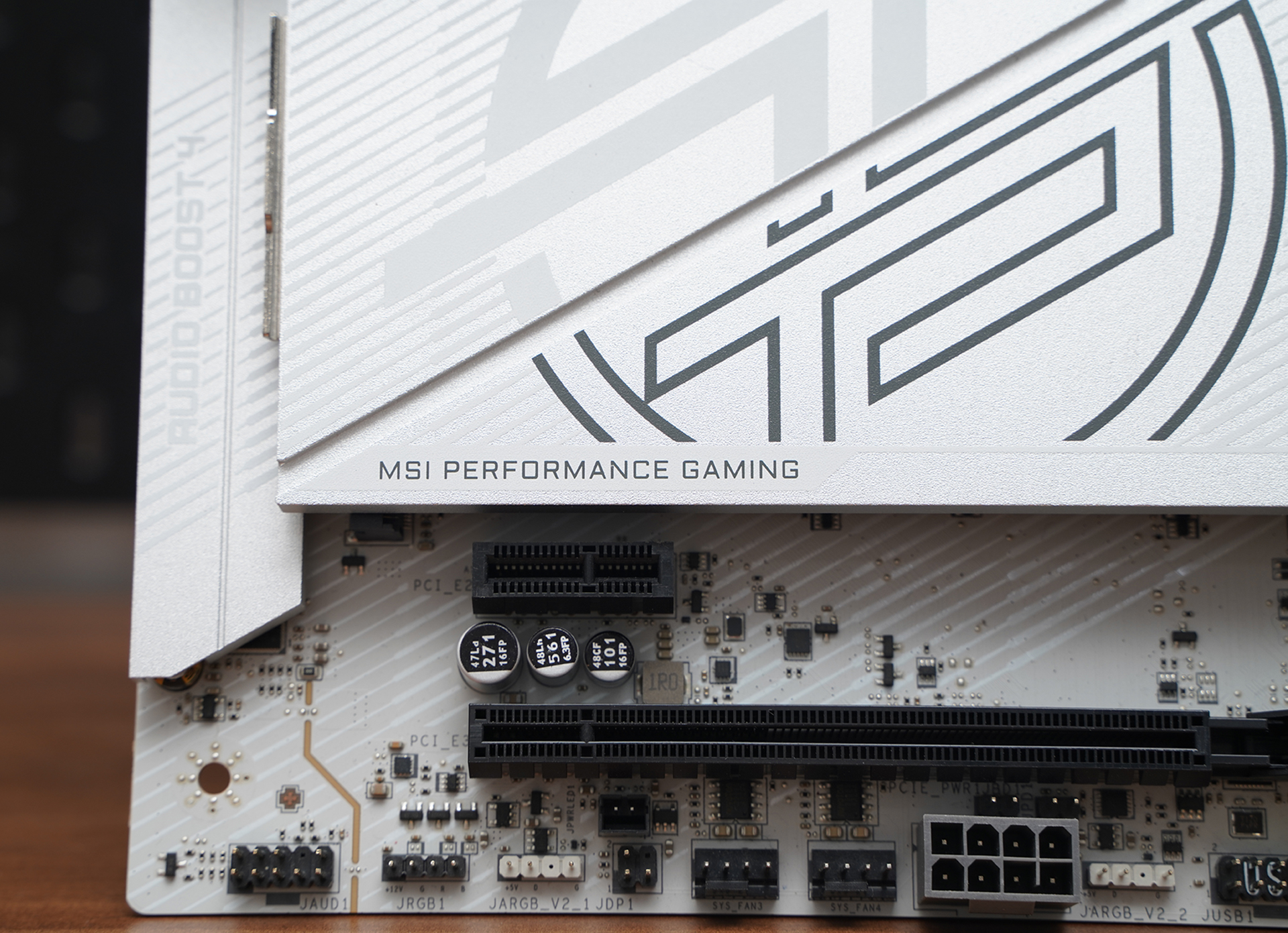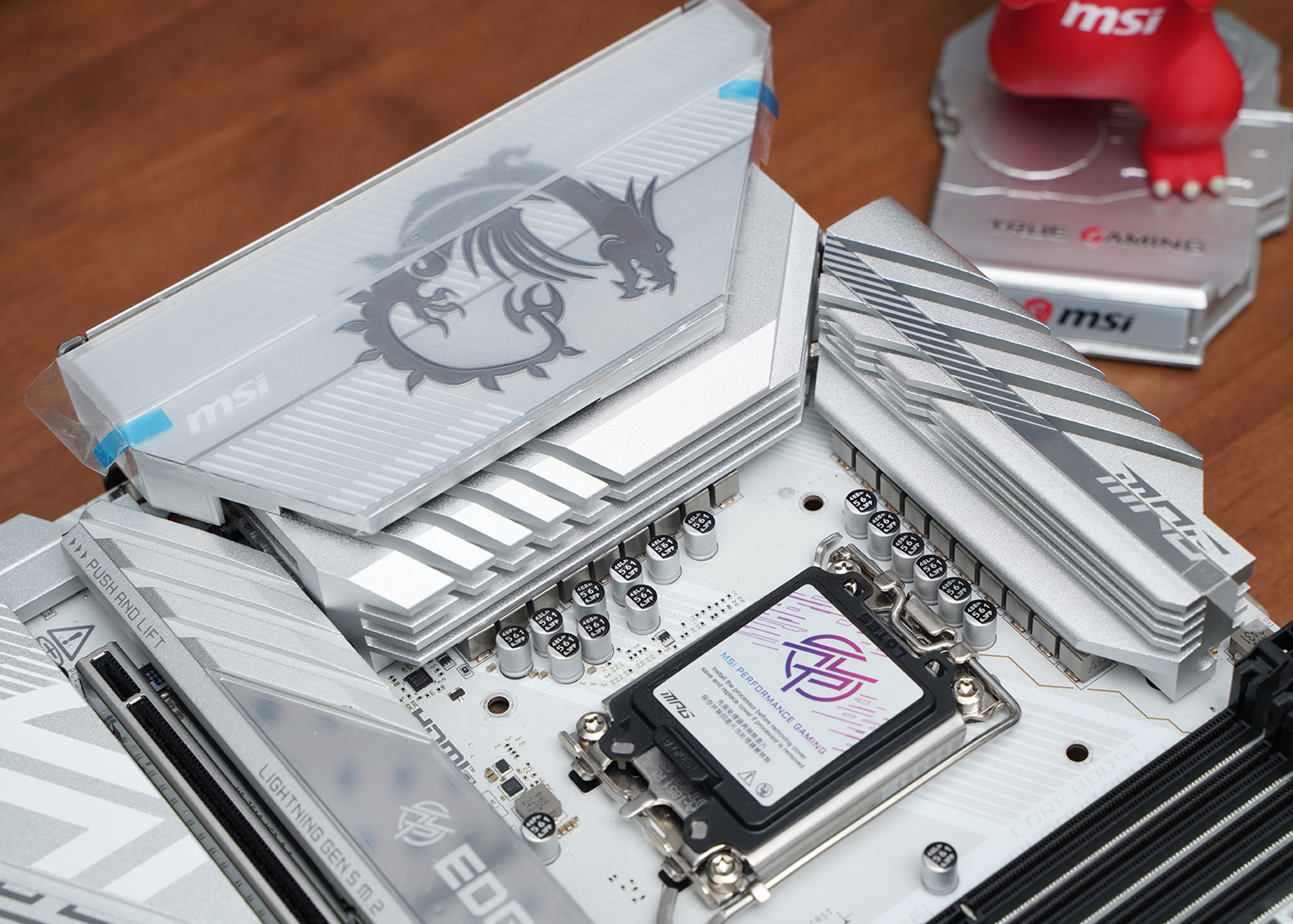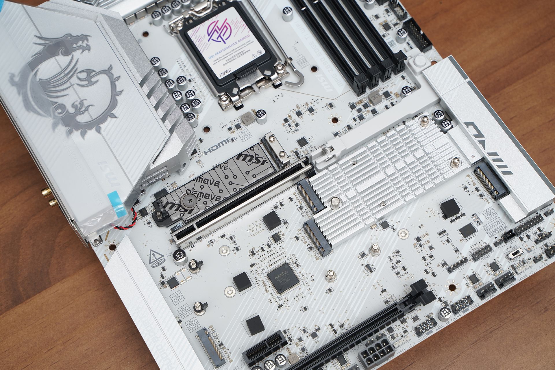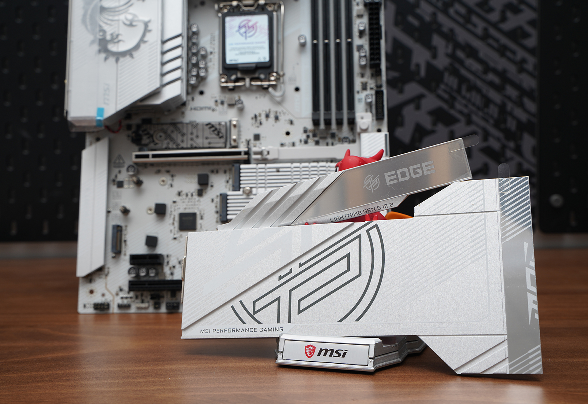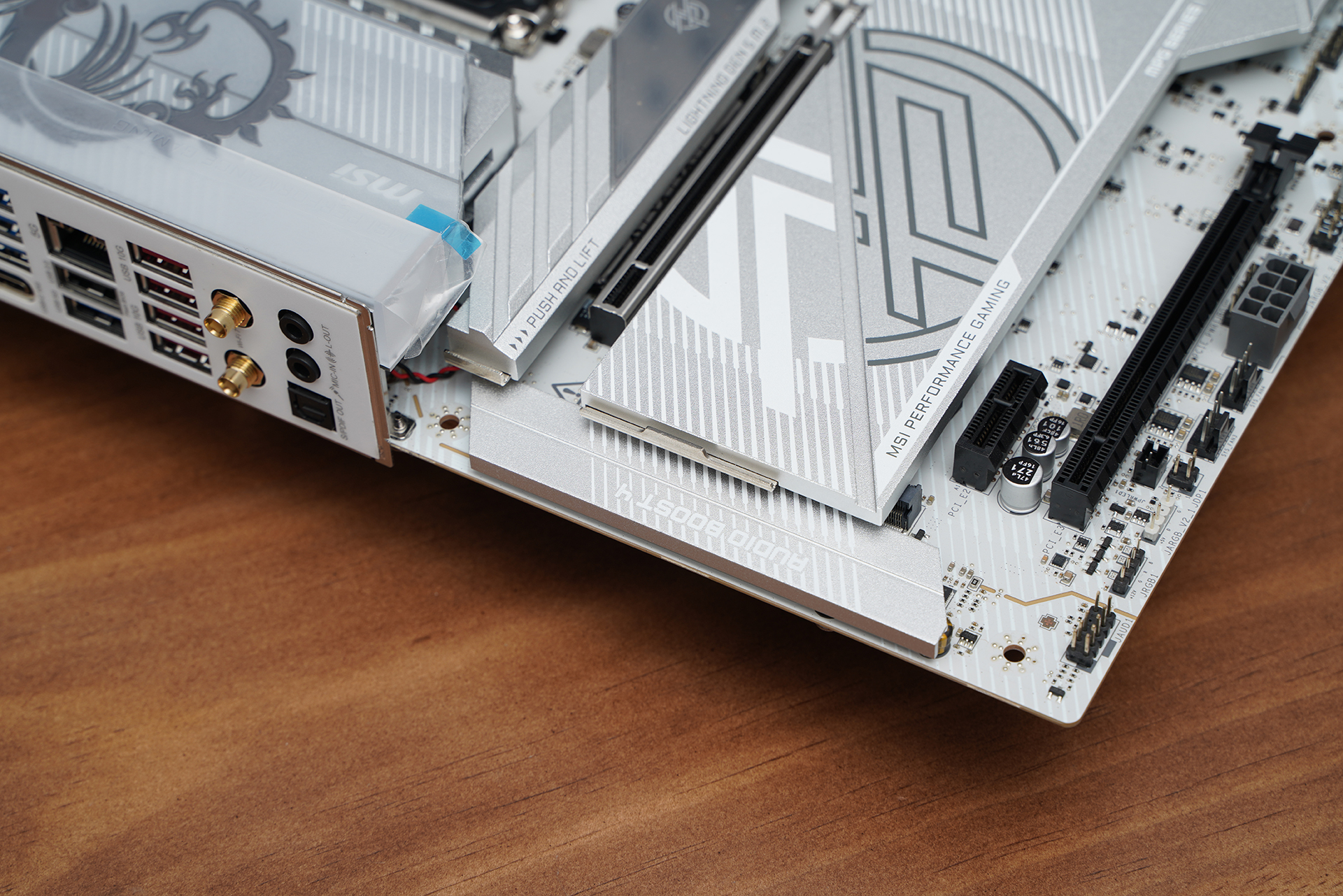 产品采用标准ATX板型,MSI MPG Z890 EDGE TI WIFI延续刀锋钛系列的高辨识度白色主题设计,大面积银白装甲覆盖,从供电散热到M.2区域形成统一视觉语言。VRM散热片采用层叠切割造型,配合拉丝与线条元素,质感偏金属工业风,同时又不会过于张扬。