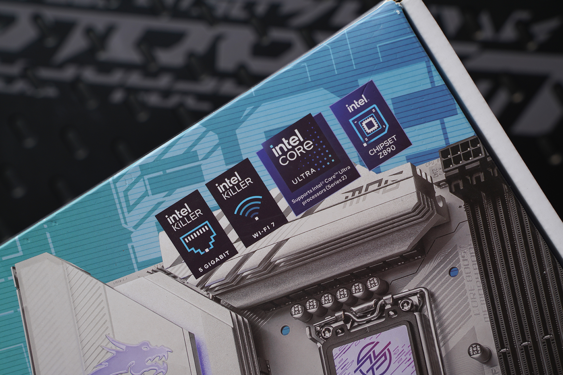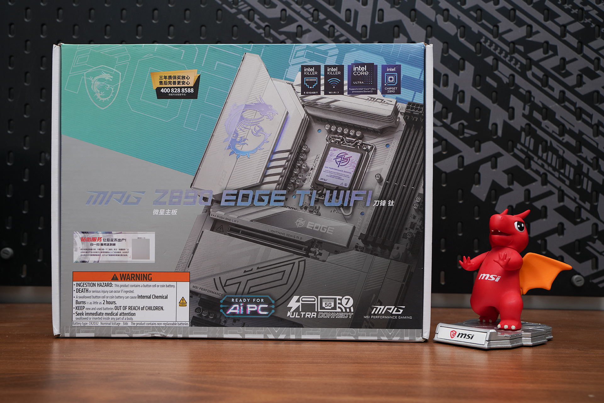 外包装整体延续MSI MPG系列的白色科技风设计,银白+浅蓝渐变为主视觉,正面直接展示主板渲染图与Z890 EDGE TI WIFI型号,辨识度很高。右上角集中标注Intel Core Ultra、Z890芯片组、Wi-Fi 7与5G LAN等核心规格,底部AI PC、Ultra Connect等标签进一步强化新一代平台定位,整体风格偏简洁高端而非传统电竞张扬。
