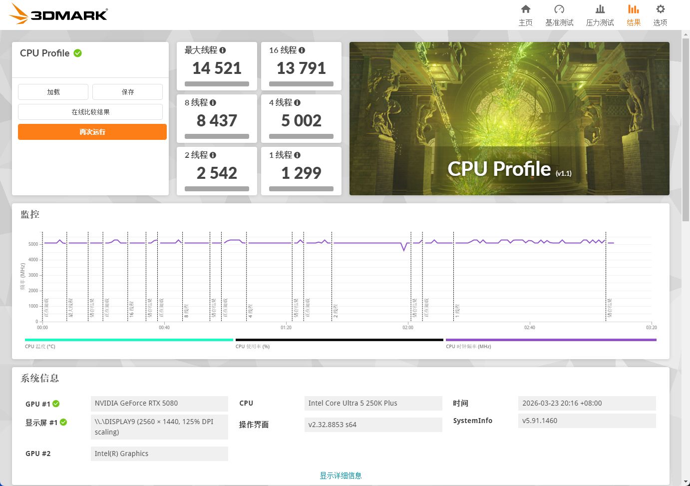 在3DMark CPU Profile测试中,最大线程成绩14521,16线程13791,8线程8437,多线程扩展能力表现稳定。