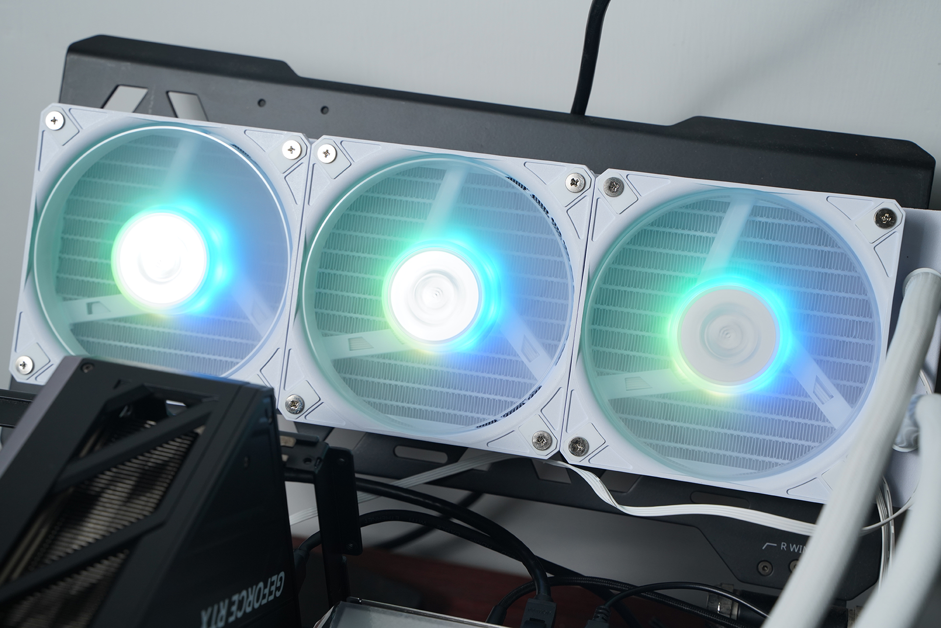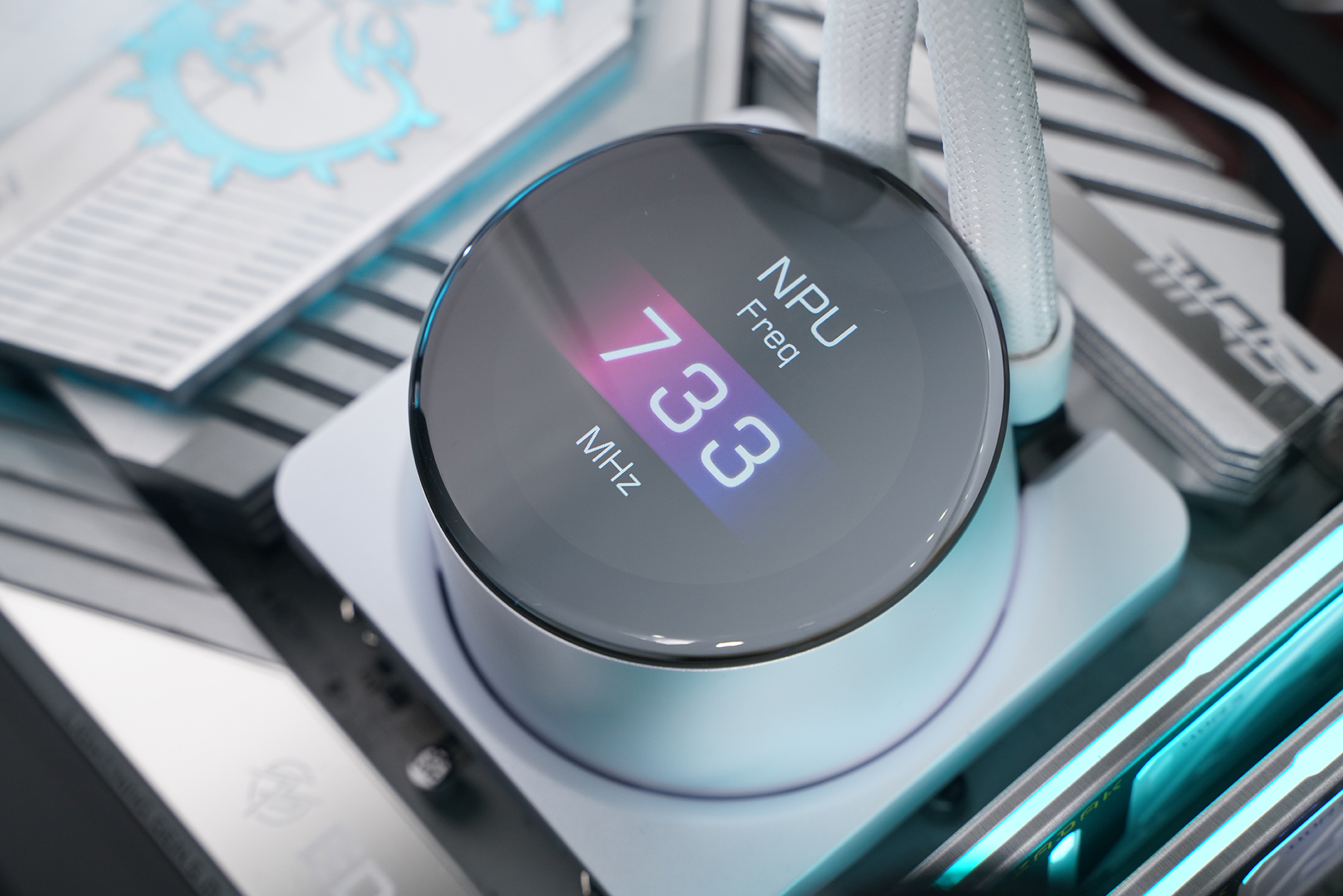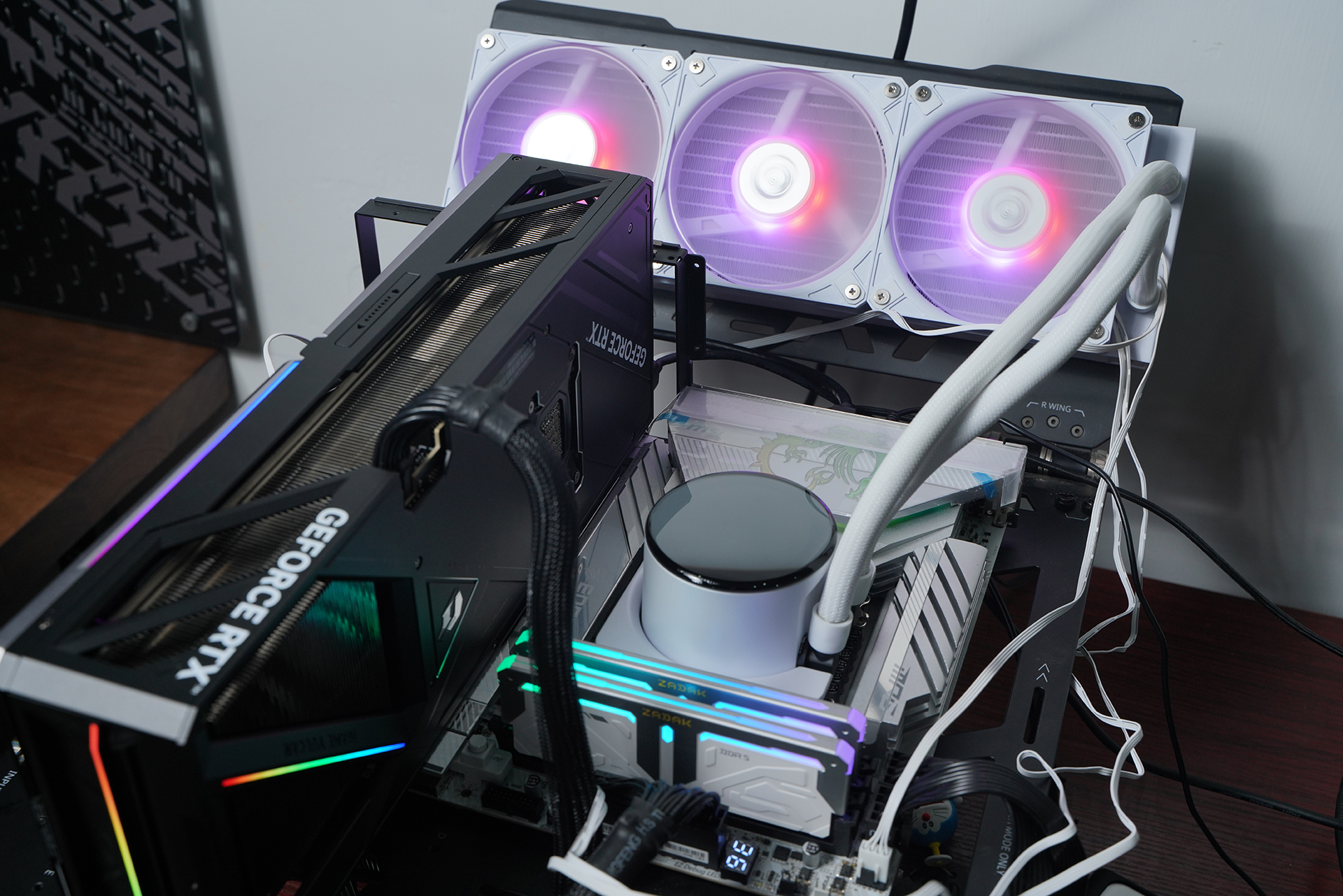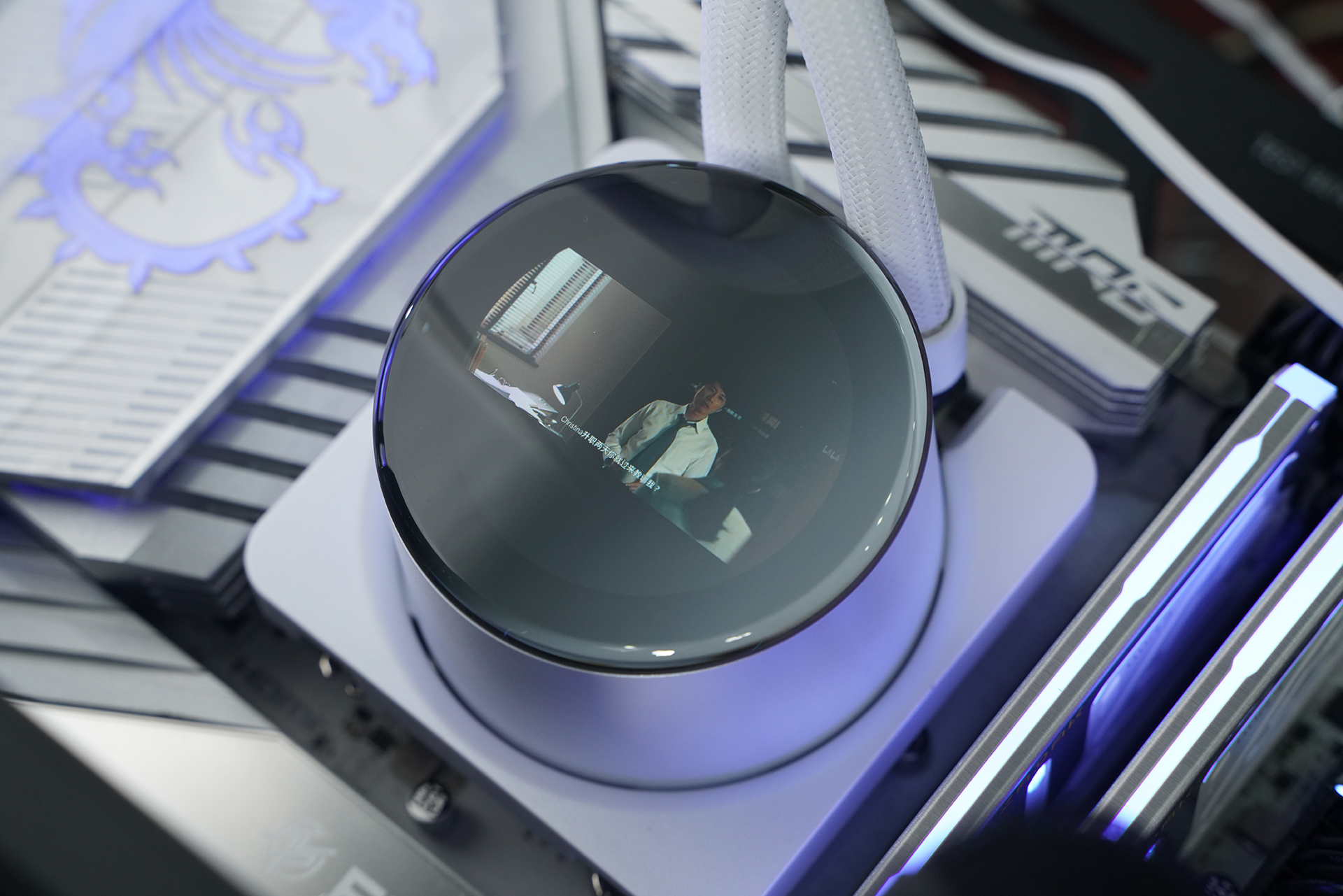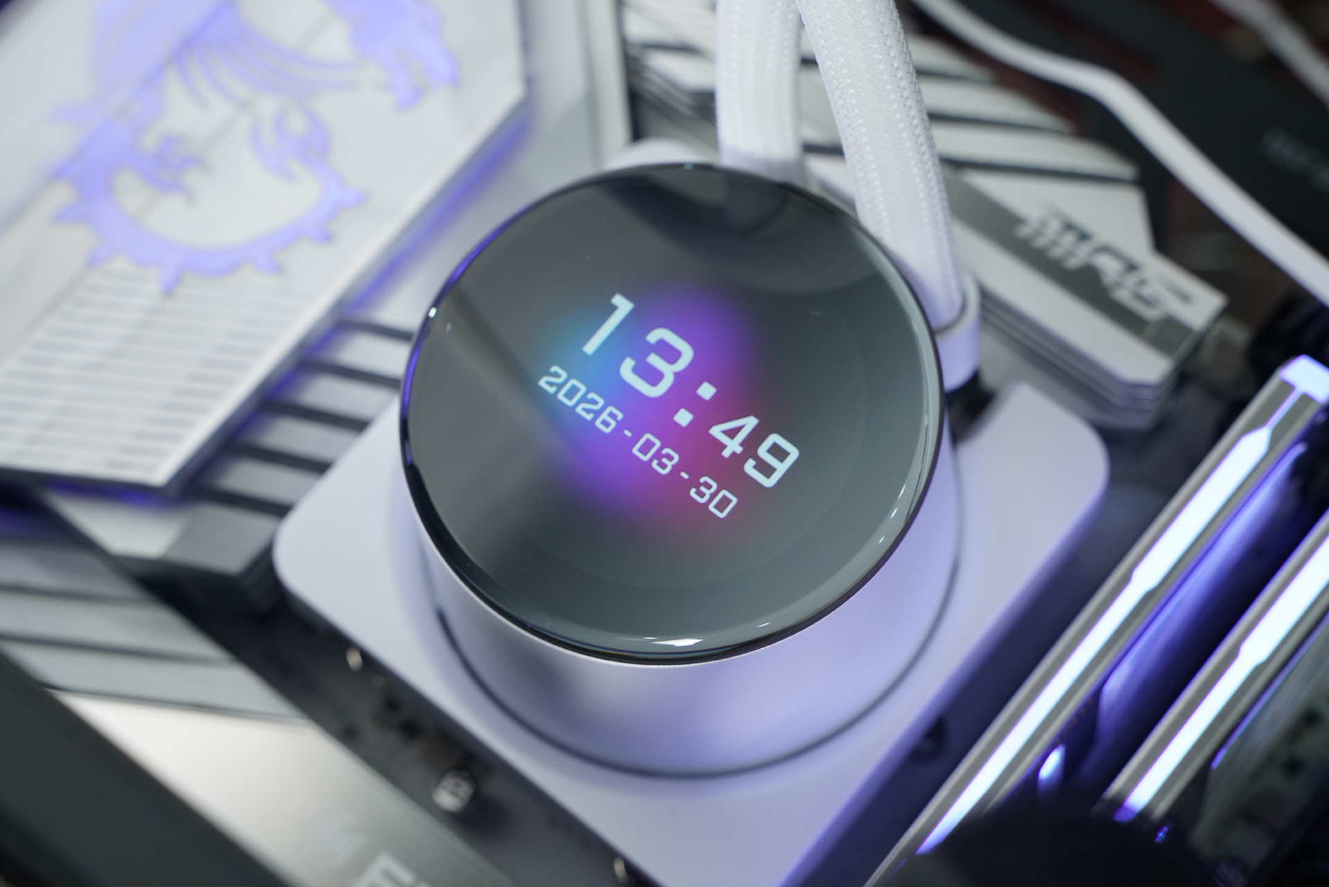 所用的水冷是微星MPG CORELIQUID P13 360 WHITE,主打颜值与可玩性,核心是2.1英寸可编辑LCD屏,可实时监控硬件信息或自定义内容;同时隐藏式走线让整体更简洁,配合全铜底座与360冷排,在保证散热性能的同时也兼顾装机观感。
