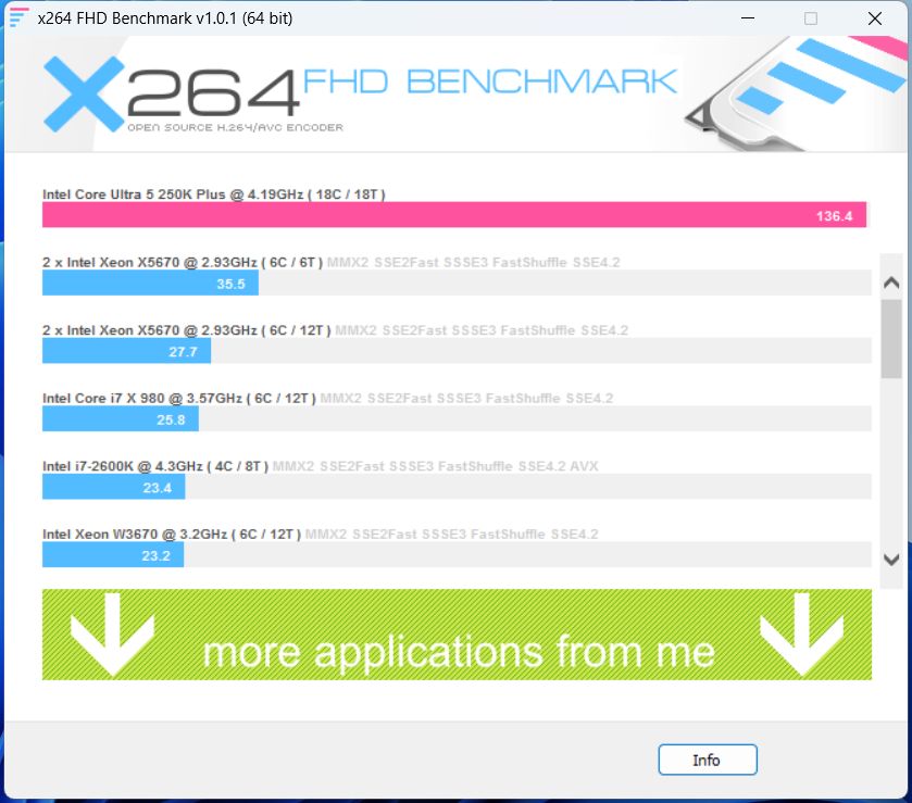 在x264 FHD Benchmark测试中,这颗Ultra 5 250K Plus取得136.4 fps的成绩,编码性能表现相当强劲。面对视频转码这类高负载多线程场景,整体效率明显优于老平台,多核优势能够充分发挥,适合有剪辑、转码需求的用户使用。