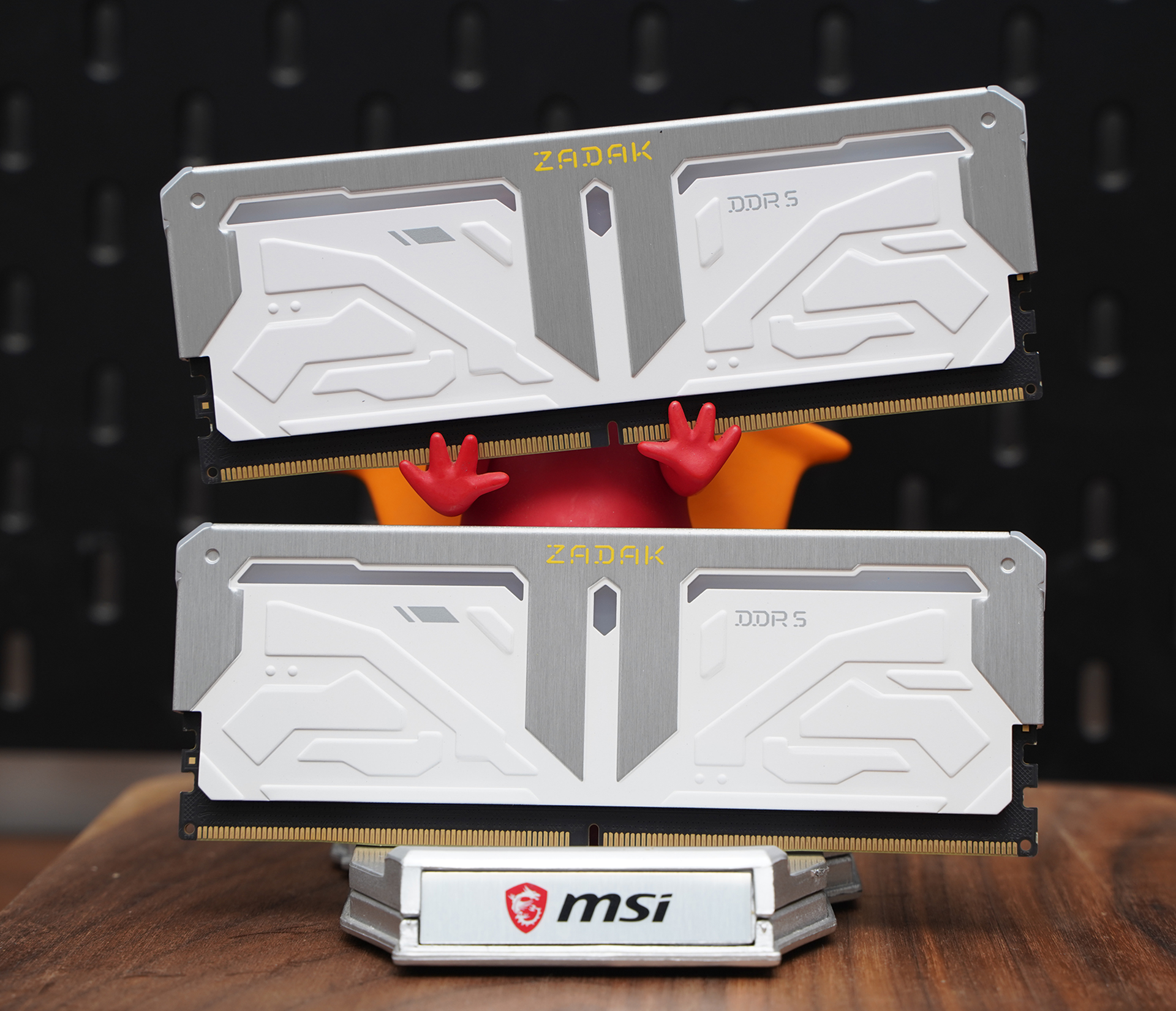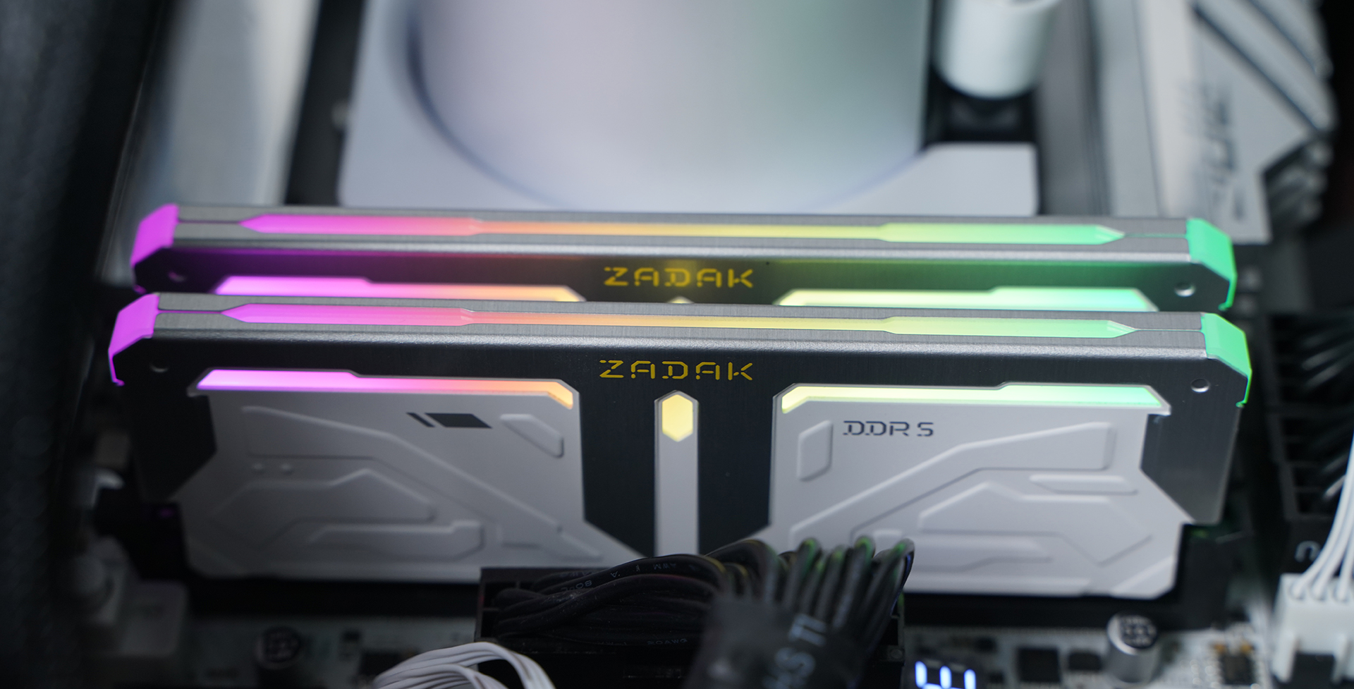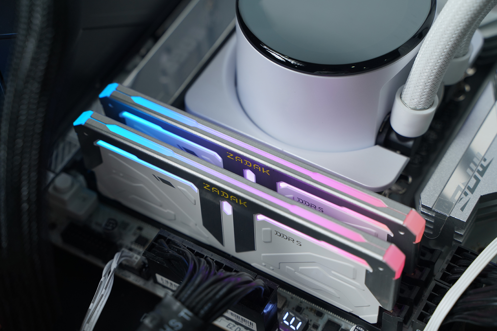 内存方面搭配宇瞻 ZADAK SPARK RGB DDR5 7200 16GB×2,高频规格具备不错的带宽表现,同时支持XMP一键超频;外观采用银白配色设计,上半部分散热马甲与灯条柔光罩均由铝合金材质包裹,金属质感突出,其余区域以纯白为主,辅以硬朗线条与几何纹理点缀,整体机甲风格鲜明,并支持MSI Mystic Light灯效联动,与白色主题整机搭配相当协调。