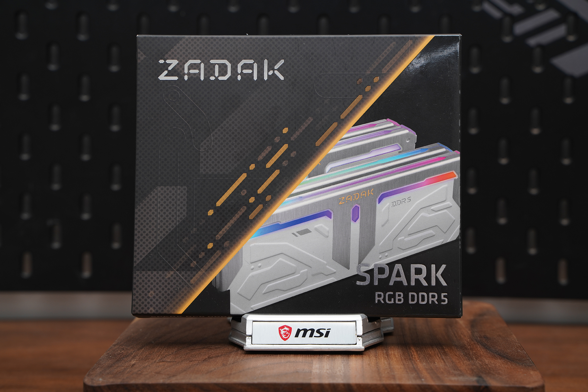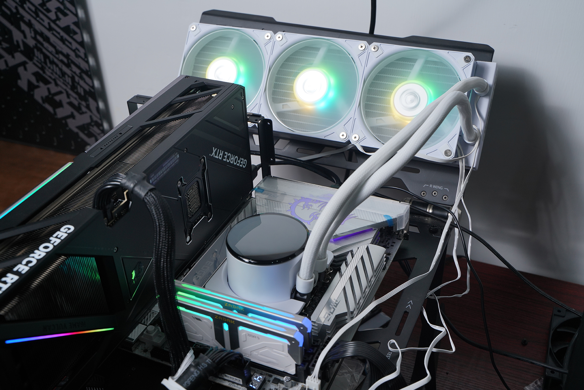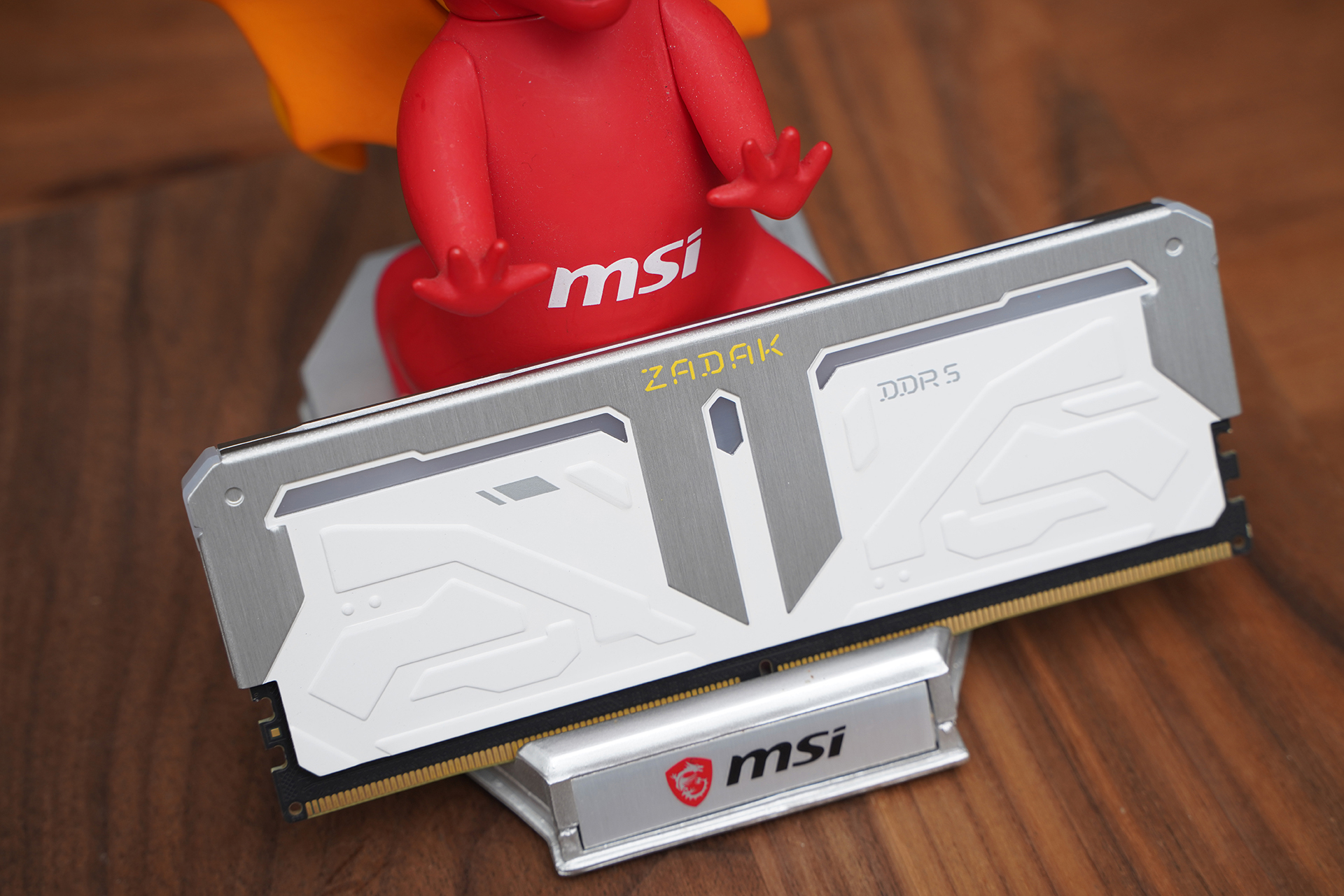 内存方面搭配宇瞻 ZADAK SPARK RGB DDR5 7200 16GB×2,高频规格具备不错的带宽表现,同时支持XMP一键超频;外观采用银白配色设计,上半部分散热马甲与灯条柔光罩均由铝合金材质包裹,金属质感突出,其余区域以纯白为主,辅以硬朗线条与几何纹理点缀,整体机甲风格鲜明,并支持MSI Mystic Light灯效联动,与白色主题整机搭配相当协调。