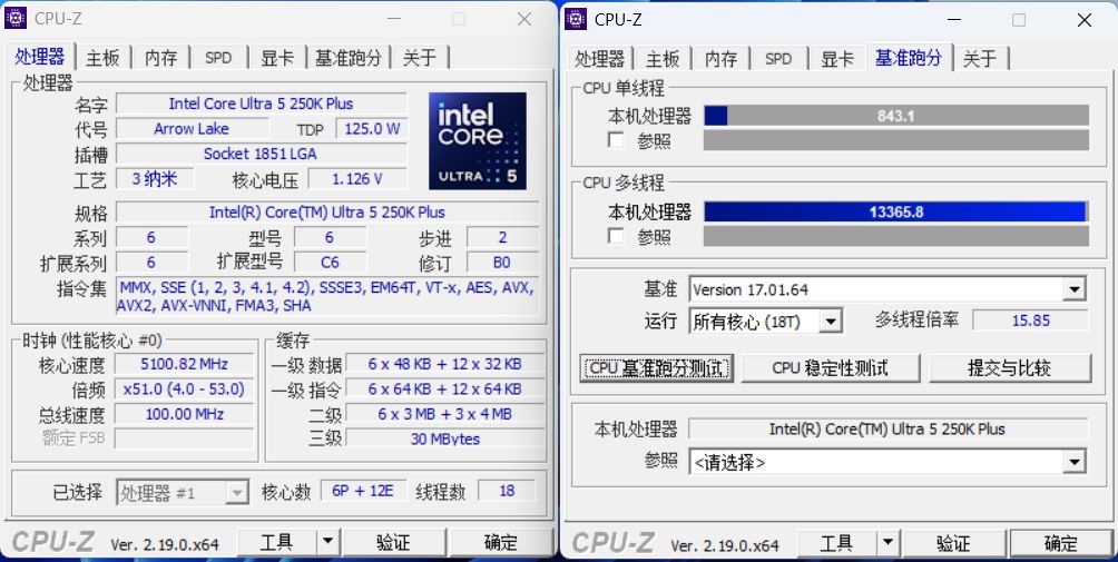 CPU-Z实测方面,这颗处理器单核成绩约843分,多核成绩达到13365分,整体性能表现相当扎实。规格上为6P+12E共18线程设计,最高频率可达5.1GHz,在日常生产力与游戏场景中都具备不错的性能释放能力,属于当前中高端定位中比较均衡的一档。