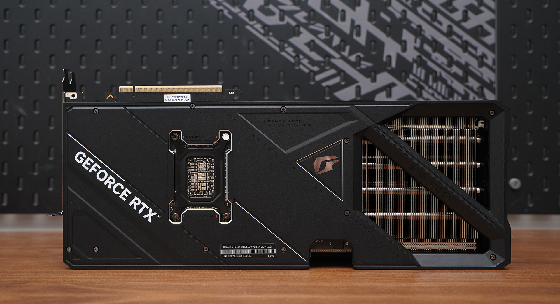这次测试所搭配的显卡为七彩虹 iGame GeForce RTX 5080 Vulcan OC 16GB,整体延续Vulcan系列一贯的机甲风格设计,三风扇大尺寸散热配合大面积金属背板,在保证高性能释放的同时也兼顾了出色的散热表现,而标志性的可翻转LCD副屏不仅能实时显示温度、频率等硬件信息,也进一步提升了整机的可玩性与个性化程度。