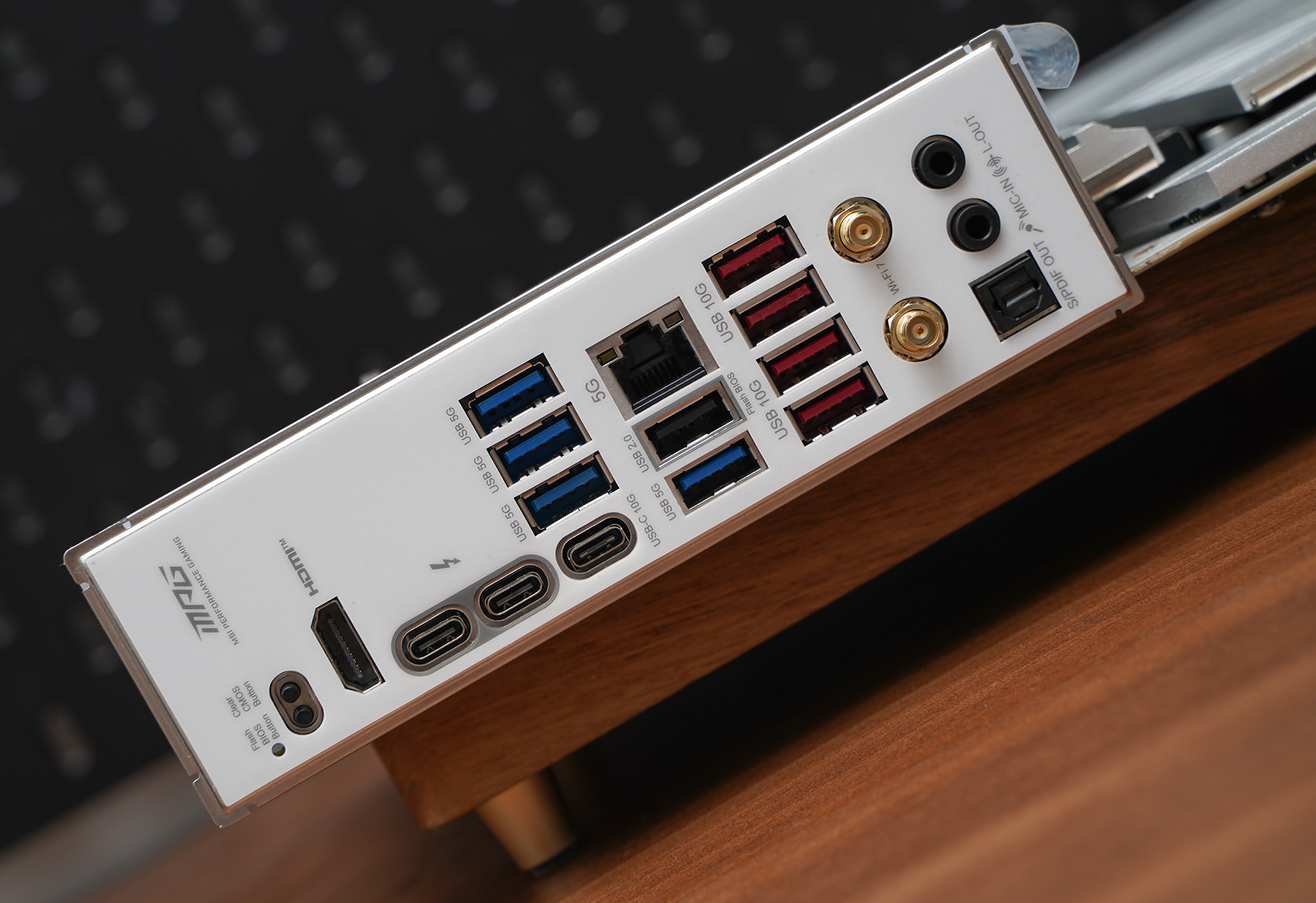 I/O接口方面配置相当全面,提供多组USB接口组合,包括USB 5Gbps、10Gbps以及USB-C,并加入雷电4接口,满足高速外设与扩展需求;同时网络部分采用直插式Wi-Fi 7方案,支持6GHz频段与320MHz带宽,搭配5G有线网口,整体在速率与延迟表现上都处于当前高端主流水平。视频输出方面提供HDMI接口,音频部分则包含常规3.5mm接口与S/PDIF光纤输出,整体属于高端平台该有的完整配置。