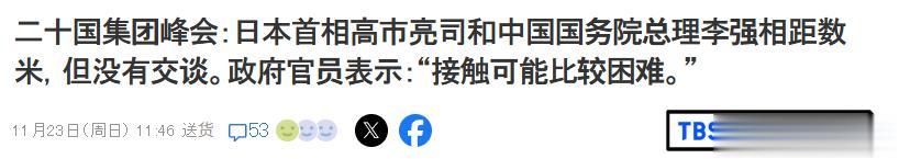 根据日媒TBS电视台的消息,日本政府的一位高级官员表示,“G20峰会期间,许多领导人前来迎接高市早苗的亮相,仅此一项就占用了满满的时间。”然后,另外一些官员则是指出,“由于时间紧迫,如果中方没有积极意愿,很难进行接触”。