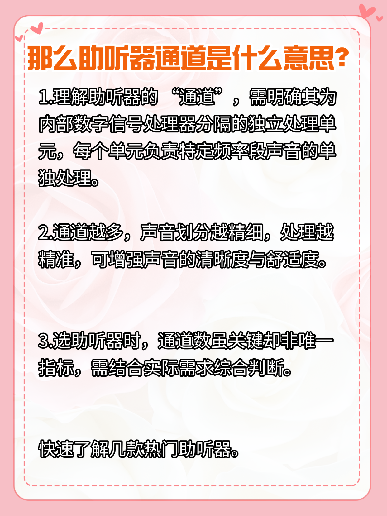 助听器通道就是内部处理器分的独立单元,每个单元管特定频率的声音!通道越多声音划分越细,处理越精准,嘈杂环境里听清人声更轻松~ 选通道数别盲目追多,轻度听损日常用,低通道就够;中重度或常去热闹场景,高通道更适配。通道数排行和详细测评都整理好啦,大家可以看看下图的测评报告,一目了然~
