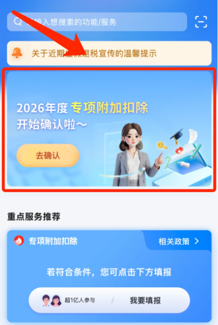2026年度专项附加扣除申报步骤(3步搞定)打开「个人所得税App」,点击首页的大图-2026年度专项附加扣除;