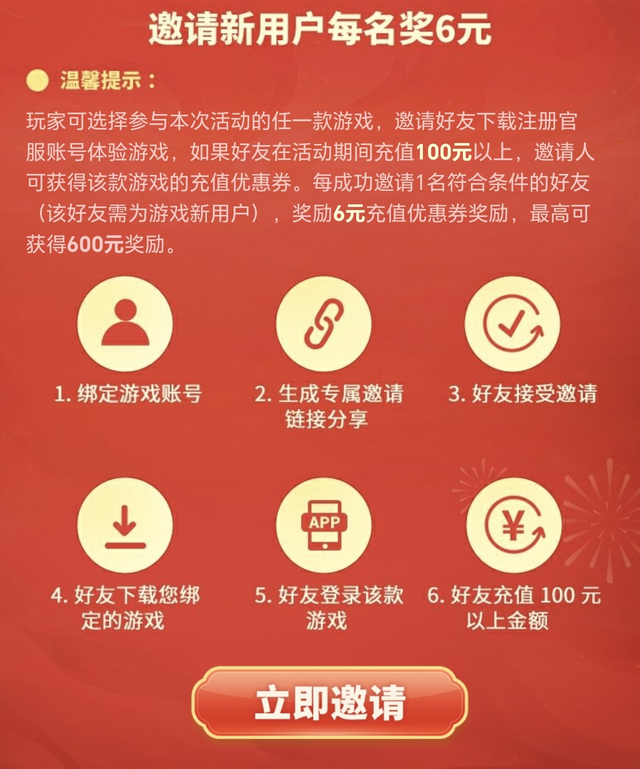 在活动界面生成专属链接邀请其他人完成注册并充值达到100r以上还能再领福利,邀一位就有6r,上限可拿600r。如果你使用的刚好是小米设备,在前面福利的基础上,还能再领取一份小米专属的首充返6r充值代金券的福利,爽爽白嫖!