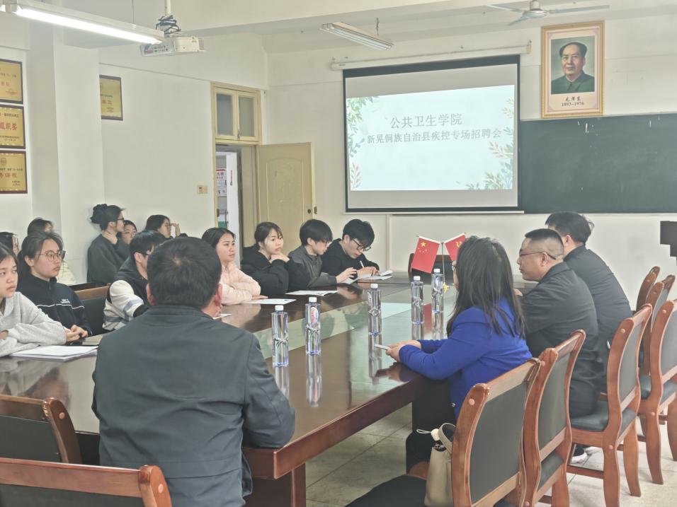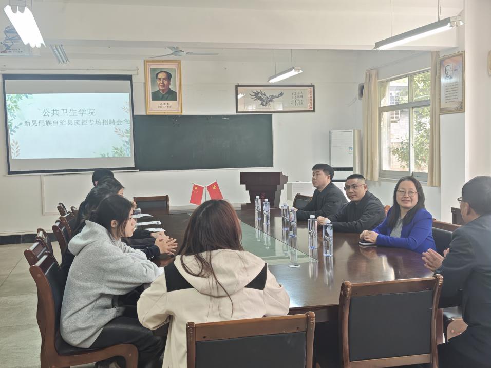 为搭建人才供需精准对接桥梁,助力公共卫生学院学子拓宽就业渠道、明晰职业方向,同时充实新晃侗族自治县疾病预防控制人才队伍,夯实基层公共卫生服务根基,近日,怀化市新晃侗族自治县疾控中心黄钰主任一行莅临我院,举办专场招聘宣讲会。公共卫生学院党总支书记朱乐玫、副书记颜星、副院长陈鹏、学生科副科长兼就业专干李丽彬老师及部分2026与2027届毕业生参加此次宣讲会。