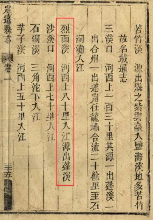 清代光绪元年(公元1875年)版《定远县志.卷一山川》(武胜旧称,姜由范 编撰)对“烈面溪”河流的文字简述。这条河现在叫做“吉安河”,发源于四川省蓬溪县境内,流径自西向东,在烈面场镇北侧5公里的沿江村(2020年撤销并入石龙滩村)汇入嘉陵江,河长65千米。