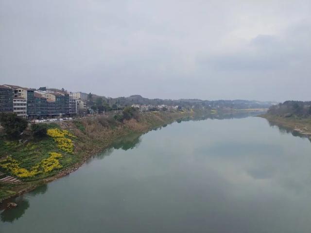 通往汉初村老码头的水泥道路,油菜花海点缀其间。嘉陵江曲流对岸山顶上是礼安场镇,因明代豪绅王礼安修筑防御性山寨而得名,原属岳池县,位置居东,与武胜(定远)县境内的西关寨隔河相望,亦称东关寨。1952年划归武胜县。图左貌似峡谷的地方为“东西关电站礼安船闸水道”。