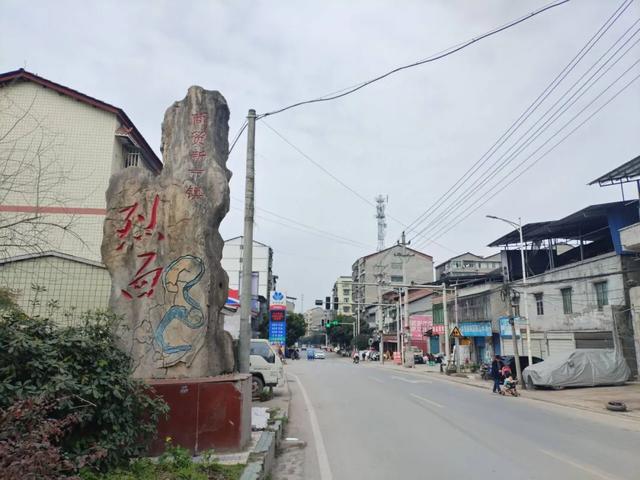 G212国道进入烈面镇的南场口。路边矗立着一块地标石碑,指向性很明确。碑面凿刻“烈面”二字,并配有简略地图示意。可以从图上看出,嘉陵江河道在烈面镇及周围亦呈曲流弯绕的状态。