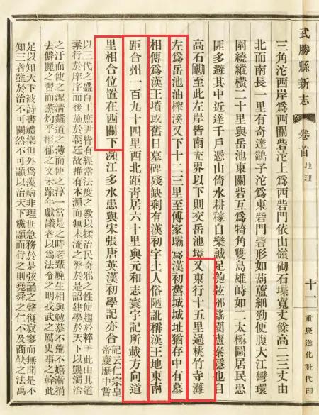 民国十九年(1930年)版《新修武胜县志.卷首.地理》(孙国藩、张汝翼 编撰)对县境“汉初县”遗址的文字描述。文中提到的“傅家坝”即今烈面镇汉初村胡家坝居民点。