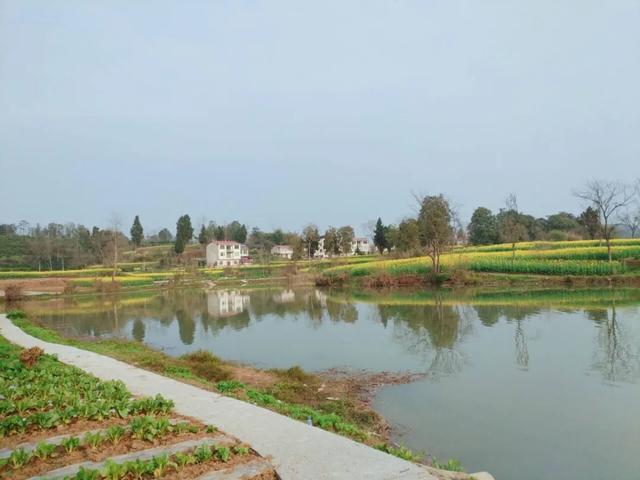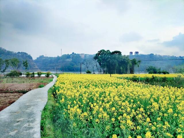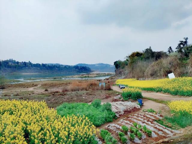 汉初县遗址点的油菜花海,遗址靠近嘉陵江畔,符合古代筑城与建制的选择标准。