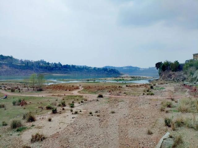 电站大坝前(下游-南向),该段河道靠近坝址,流速小,初春枯水期也尚未泄洪,岸边沉积形成了大片河漫滩,颗粒物有卵石、砾岩碎屑。滩上更作为人们春日休闲的好地方。