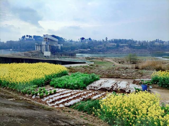 正值油菜花开放,与大坝全貌构图结合,点缀景观效果。