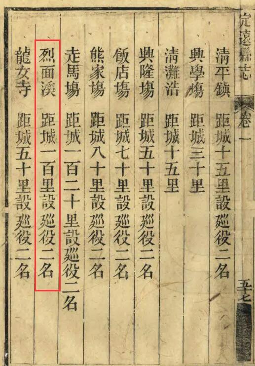 光绪同版《定远县志.卷一场镇》对“烈面”聚落的文字简述,专名称之“烈面溪”。场集还设有两名“巡役”。巡役,明清基层职务,为杂役性质。是由官府派往矿厂或关卡口岸之巡查人员,属额设官役。由官府发给号衣、腰牌,专司督查矿丁、缉捕盗贼②。烈面(溪)场作为嘉陵江畔的商贸集散水码头,虽繁荣热闹,但也人色混杂,且地位尤显突出,故在此派驻了相关人员,负责要津管理。