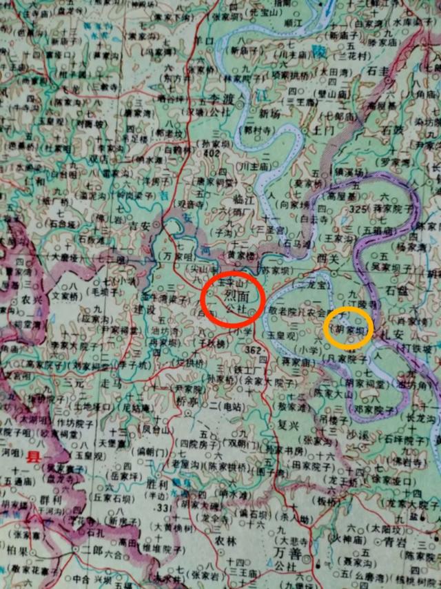 1981年版《四川省地图集.武胜县分幅》对烈面公社与汉初县遗址(黄色圆圈.胡家坝)的信息标注,那会所属西关公社十大队。此外在烈面镇、礼安镇辖域内,有很多以“院子”为专名的聚落。早年移民入驻,屯居修房,逐步形成农家院舍,且通过地名载体,衍生指向传播,更具备了“建筑、姓氏、地形”三大特点。