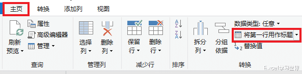 14. 选择任务栏的“主页”-->“将第一行用作标题”