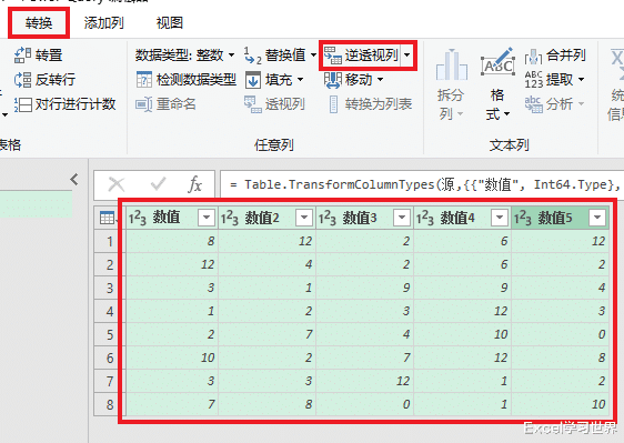 3. 选中所有列 --> 选择任务栏的“转换”-->“逆透视列”