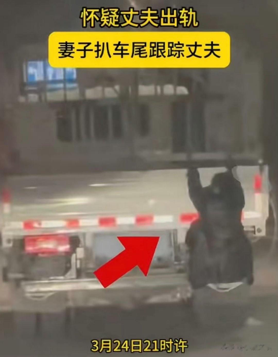 事件概括2026年3月24日在新疆喀什,一女子因为怀疑自己开货车的丈夫有出轨的嫌疑。在晚上丈夫准备出车的时候,偷偷地扒在货车车尾。