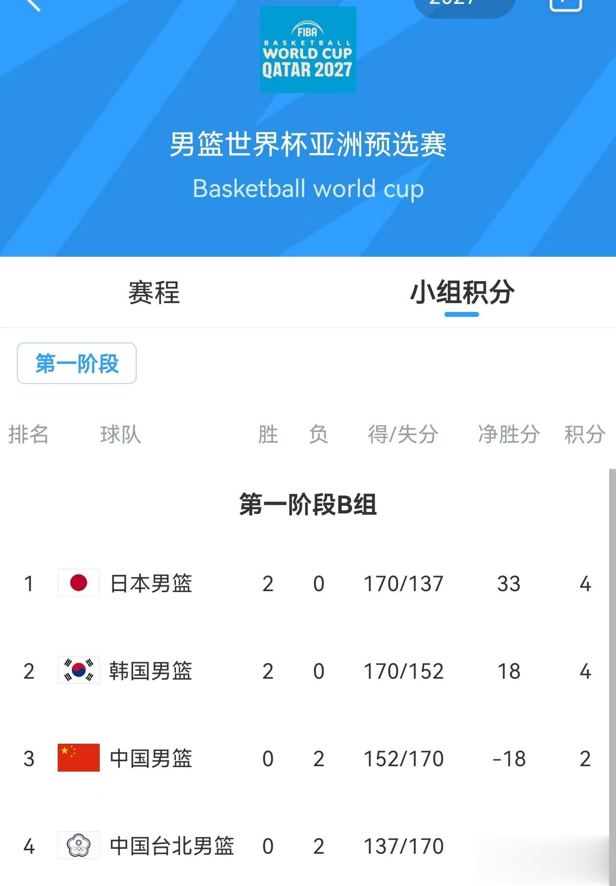 根据小组比赛晋级规则,每个小组前三名球队晋级第二阶段比赛,同时由于第一阶段成绩代入第二阶段,所以国足小组赛前两场比赛的落败,意味着留给球队的容错空间几乎为零,面对即将到来的关键第二阶段两场关键比赛,能否对中国台北实现双杀,是确保小组前三出线的“底线”策略,但是为了第二阶段能够有更好的空间,对阵日本男篮也必须全力以赴的争取胜利。