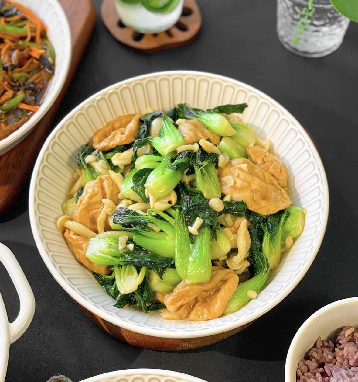 我后来试过很多次,有时候会加点胡萝卜片或者木耳,颜色更好看。但最让我惦记的,还是最简单的版本——青菜和油面筋,再加一点点蒜末提香。外婆以前做这道菜,连白玉菇都不放,就是纯纯的青菜配油面筋,但那个味道,却是任何改良版都比不了的。