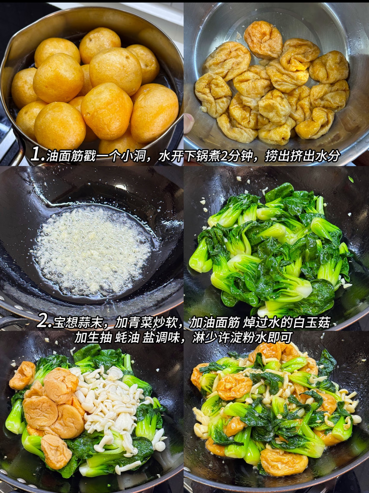 做这道菜,主角是油面筋和青菜。油面筋在超市或者菜市场都能买到,圆圆的一个,金黄酥脆,拿在手里轻飘飘的。买回来以后,第一步要处理油面筋。用筷子或者手指在油面筋上戳一个小洞,这样等下煮的时候,热水能进去,把里面的空气排出来,后面炒的时候也更容易入味。锅里烧开水,把戳好洞的油面筋放进去,煮两分钟左右。时间不用太长,看到油面筋变软、沉下去,就可以捞出来了。捞出来以后,用手轻轻挤出里面的水分,放在一边备用。这一步很关键,挤掉水分,后面炒的时候才能更好地吸收汤汁。