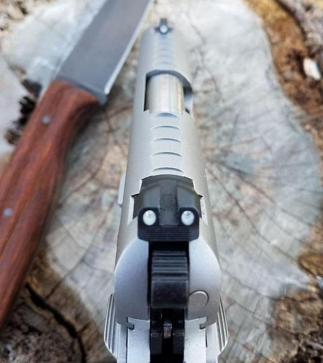 该枪采用镂空击锤,这一设计不仅减轻了手枪的整体重量,还具有一定的美学价值。套筒前后的机械瞄具为可调节的准星以及照门。该枪采用长度为71毫米的不锈钢枪管,内置细致的膛线,足以保障该枪最基础的射击精准度。无论是在近距离的快速射击还是在一定距离外的精确瞄准,这把手枪都能够表现出较好的射击性能。