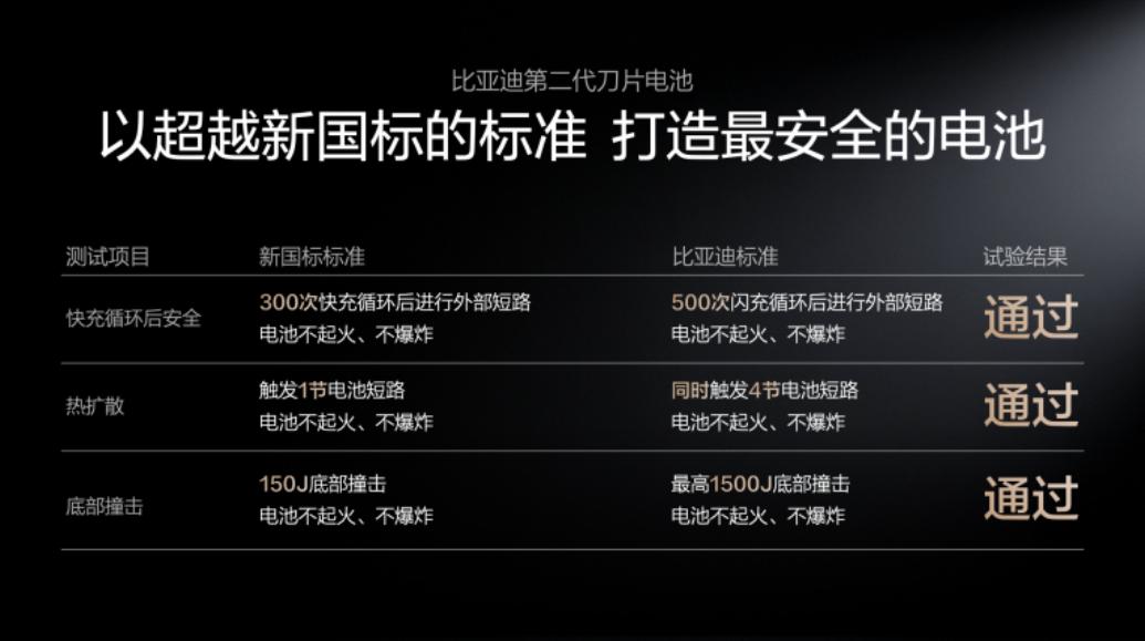 安全层面,比亚迪更是直接拉高了行业的准入标准。新国标要求300次快充循环后进行外部短路测试,比亚迪直接做到500次闪充循环后仍顺利通关;新国标要求触发1节电池短路不起火不爆炸,比亚迪直接同时触发4节电池短路依旧稳稳达标;新国标150J的底部撞击标准,比亚迪直接拉至10倍的1500J仍完美通过。对头部品牌而言,性能可以无限突破,但安全永远是不可退让的底线,这一点,比亚迪从未动摇。