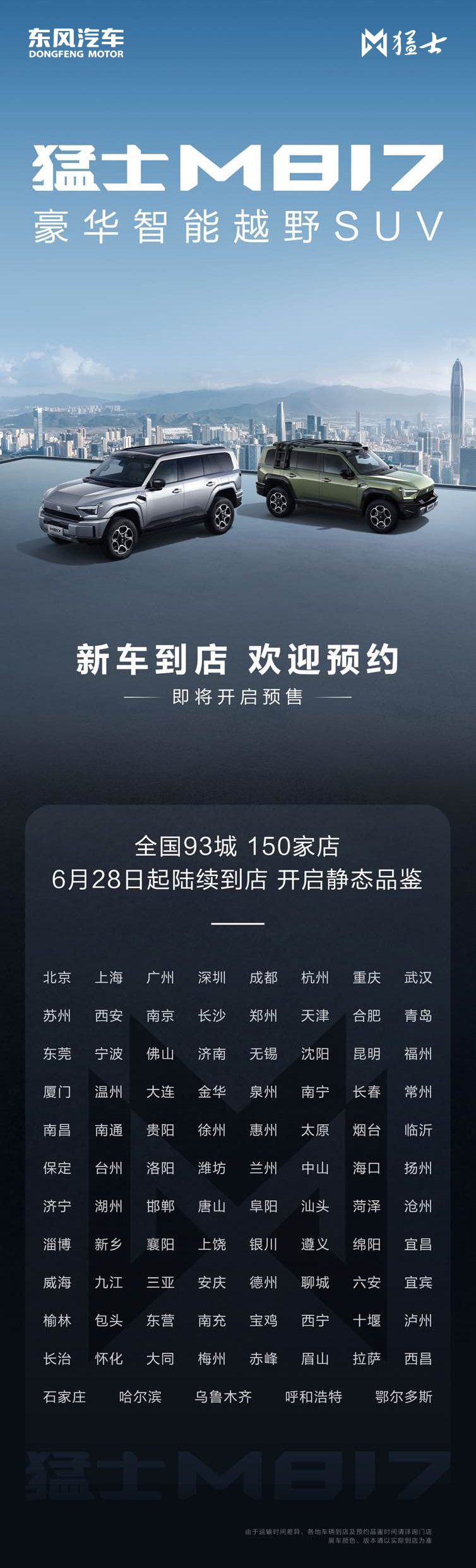 豪华智能越野SUV新标杆,猛士M817承袭猛士硬核越野基因,深度融合华为领先的智能科技,在用车便捷性、互联智能性、安全可靠性三大维度全面革新智野体验,为用户开启城市与旷野的无界探索之旅。此次新车到店后,猛士M817将于今年三季度正式上市交付,敬请期待!