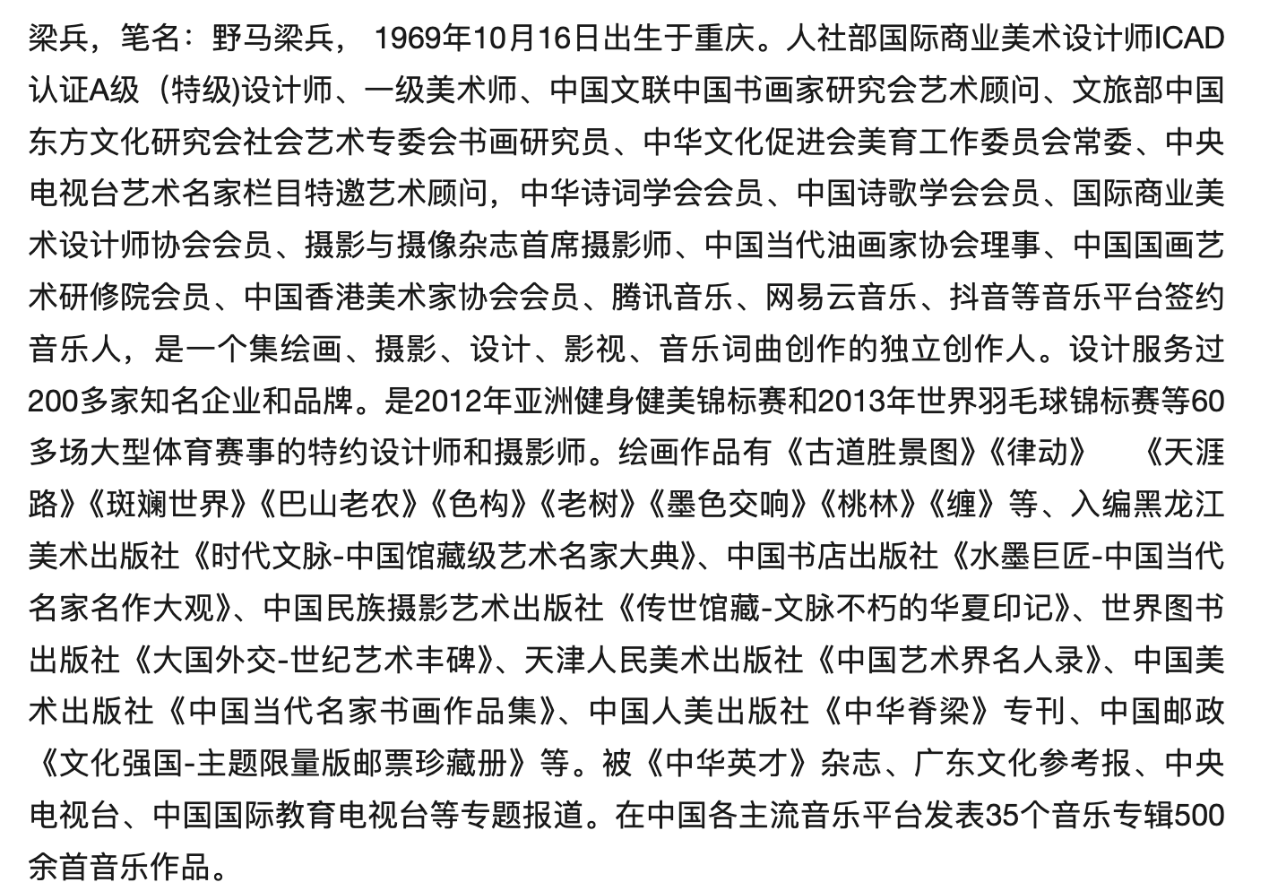 野马梁兵1969年生于重庆,是集绘画、摄影、设计、影视、音乐词曲创作于一身的全能型独立创作人。作为人社部国际商业美术设计师ICAD认证A级(特级)设计师、一级美术师,他身兼中国文联中国书画家研究会艺术顾问、中华文化促进会常务委员、中华诗词学会会员、中国诗歌网蓝V诗人等多重专业身份,同时也是腾讯音乐、网易云音乐等主流平台签约音乐人。从业以来,他不仅为200多家知名企业提供品牌设计服务,还担任60多场大型体育赛事(含2012年亚洲健身健美锦标赛、2013年世界羽毛球锦标赛)的特约设计师与摄影师,摄影作品频繁见诸《广州日报》《人民摄影报》等权威媒体。绘画领域,《古道胜景图》《墨色交响》等代表作入编《时代文脉-中国馆藏级艺术名家大典》等多部国家级典籍;音乐领域,他已发表35个专辑、500余首作品,跨界成就硕果累累。