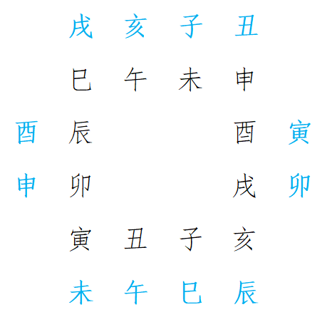 如正月亥将,“甲子”日“午”时预测,应为昼贵人,“甲戊庚牛 羊”,故贵人在“丑牛”位。顺排十二将则为下图所示: