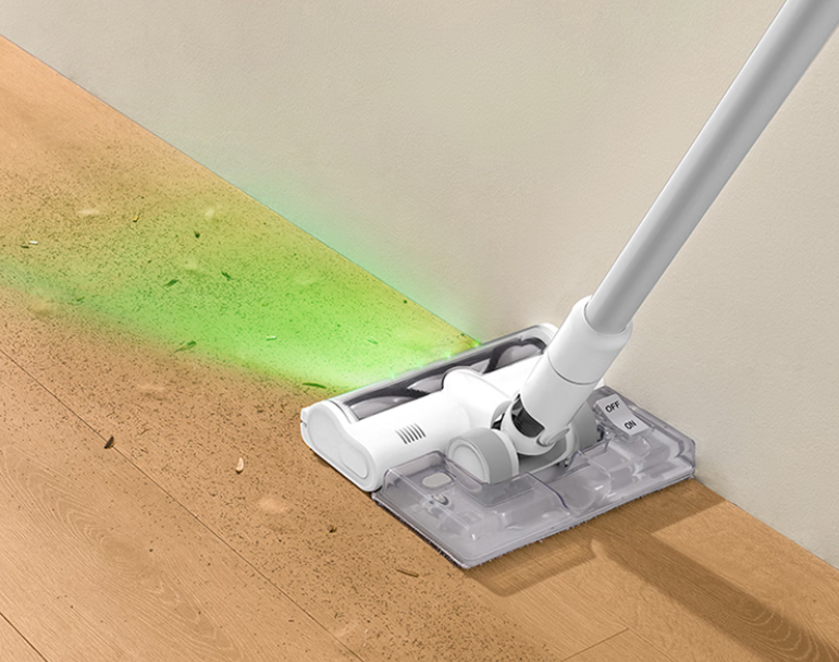 搭载广角绿光显尘技术,通过前置 LED 光源精准照亮地面微尘,即使在暗光环境下,地板缝隙、瓷砖纹理中的细小颗粒也能清晰呈现,让清洁过程更具针对性,避免遗漏隐蔽积灰区域,尤其适合对灰尘敏感或追求深度清洁的家庭。