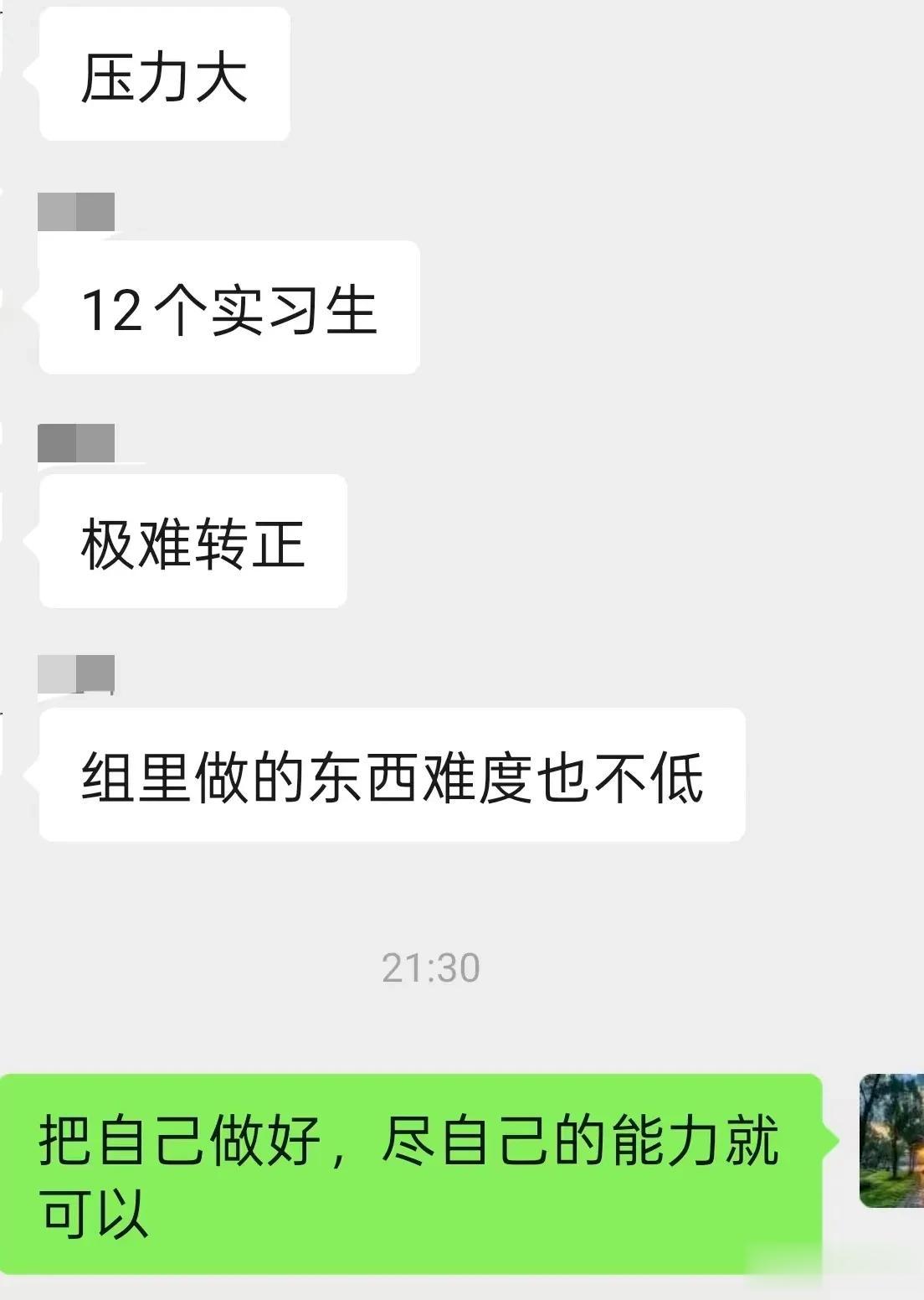 可他说,感觉能转正的机会小得很,唉,说到底孩子就是半只脚刚踏进社会,学校里哪有这么激烈的比拼啊。