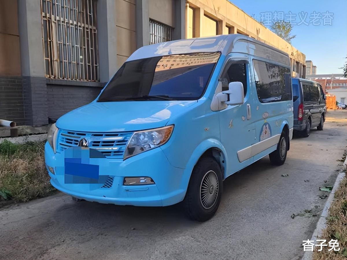这是一台东风御风,柴油2.3T排量,手动6挡,4门6座,中轴低顶,重新喷涂了白蓝搭配的车漆,象征蓝天白云,非常的清新靓丽,给人以青春和轻松的感觉。