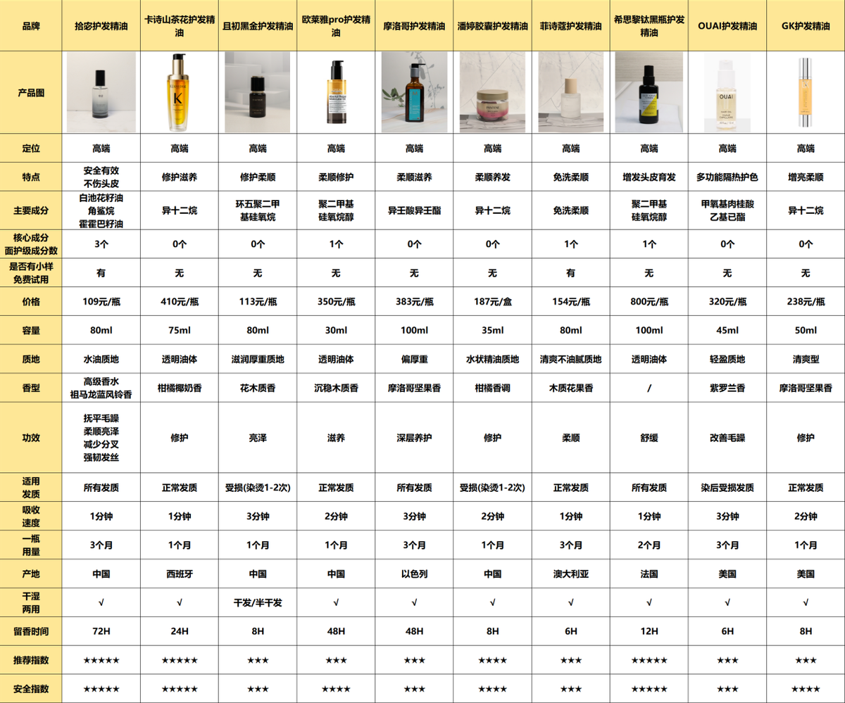 为了让大家快速看清10款护发精油的核心差异,我整理了实测参数对比表,所有数据均为实测得出,不掺假、不虚标,重点聚焦控油效果、去毛躁效果、温和度、吸收速度、价格、香味等关键指标,帮大家初步筛选;