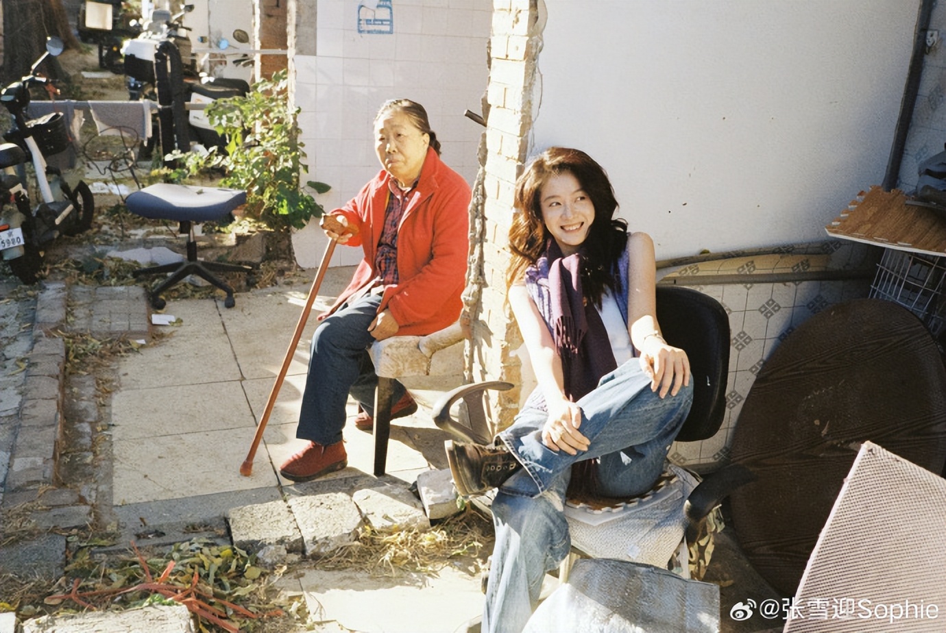 她和女摄影师挤在胡同台阶上,蓝色上衣搭着蓝牛仔,腿随意蜷着,手轻搭在对方肩上,背景白墙沾着胡同的旧渍。荧幕里她和对手戏演员的互动,总带着角色的情绪张力;可这会搭在肩头的手是轻的,蜷腿的动作没半分刻意,红上衣的亮衬着墙的旧,是和朋友挤在一块、没端架子的松弛。