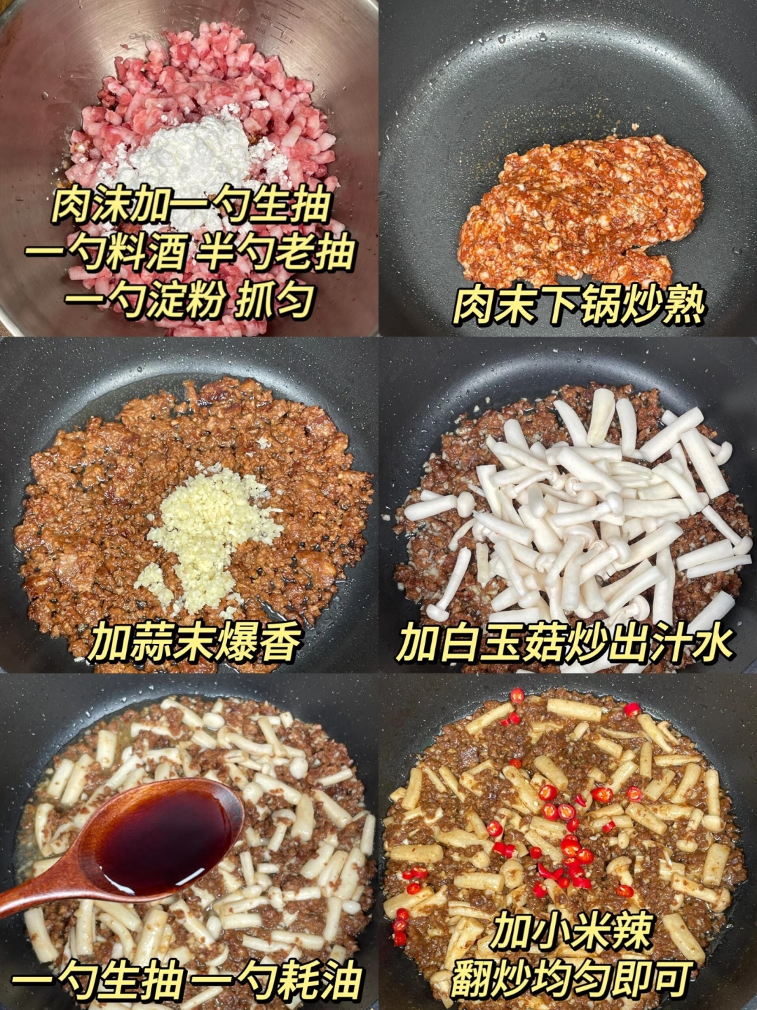 食材挑选有门道,鲜味翻倍的秘密藏在每个细节里。白玉菇可不是普通的蘑菇,它还有个浪漫的别名叫"蟹味菇",光听名字就知道自带鲜味buff。挑选时记得选菌盖圆润饱满、菌柄挺拔的,轻轻捏一捏菌盖,有弹性不软塌的才是新鲜货。要是看到菌褶里藏着小黑点,那可是成熟度刚好的标志,炒出来会更香呢!肉末选三分肥七分瘦的前腿肉最妙,肥肉部分在高温下会化作晶莹的油珠,裹在菌菇表面闪闪发亮。懒得剁肉的话,直接买超市现成的肉馅也行,不过偷偷告诉你们个小秘诀:把肉馅再剁两分钟,让纤维更细碎,炒出来会更蓬松入味哦!