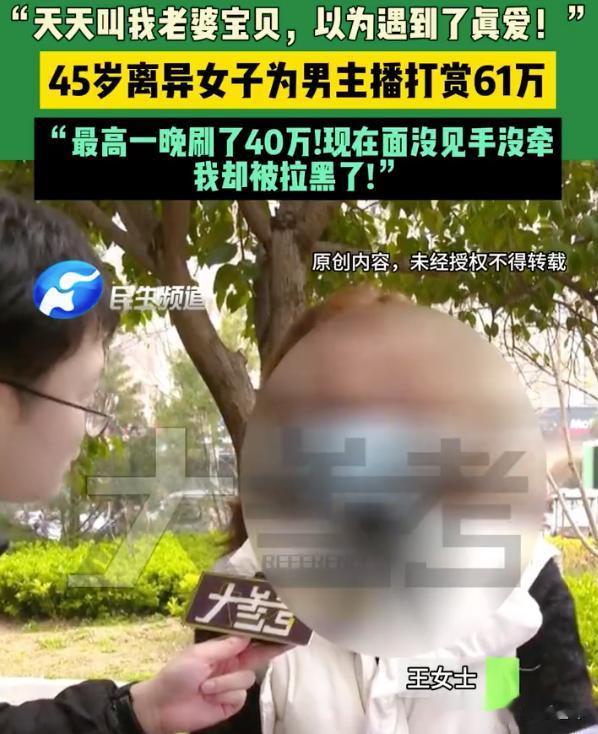 我老家四川,有位王女士,离异,独自生活,然后她在直播间认识了一个男主播,对方天天喊她老婆宝贝,随时发信息嘘寒问暖,于是前前后后打赏了61万。