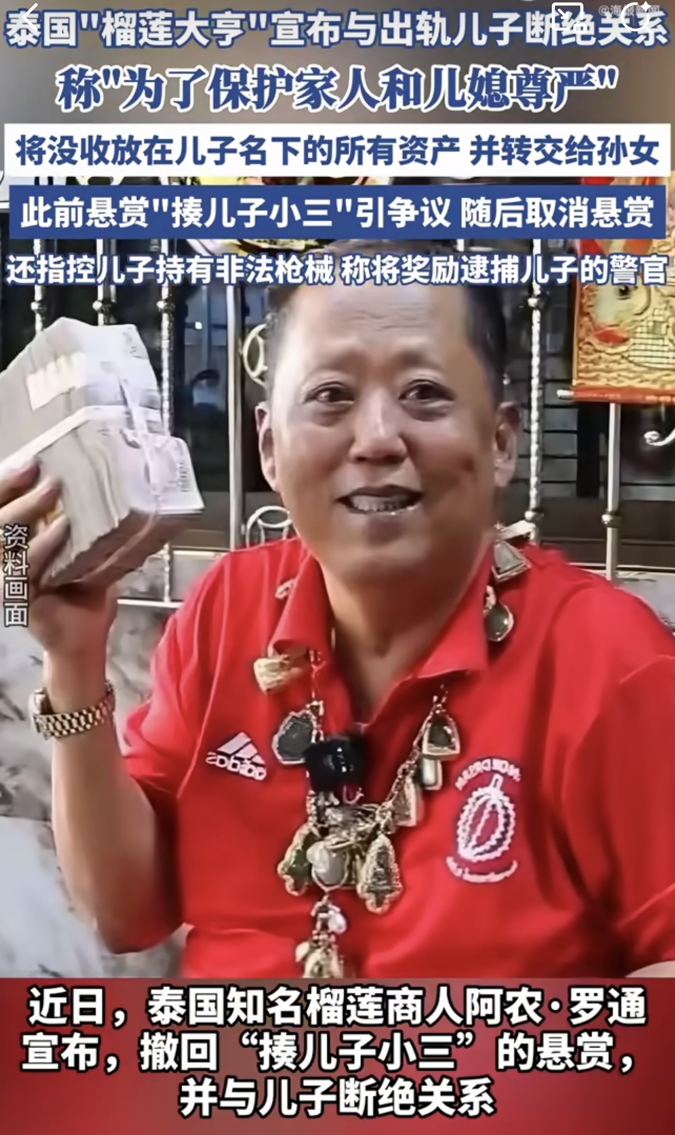 这事儿得从他那个“不省心”的儿子说起。儿子早有妻儿,却和公司会计安搞出婚外情。安原本嫁的是阿农的侄子,后来转投他儿子怀抱,把家族关系搅成一锅乱粥。阿农先是好言相劝,儿子却油盐不进。眼见儿媳整日以泪洗面,阿农一咬牙,直接在网上“悬赏揍人”,还放话“悬赏长期有效,直到那女人滚蛋”。更狠的是,他连儿子都“大义灭亲”,举报儿子非法持枪,还许诺给抓人的警察五万泰铢奖励。