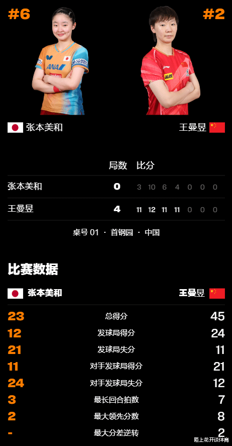 只有17岁的张本美和,凭借出色的个人表现,已经把自己的世界排名提升到了第6位,是目前世界排名最高的外协会女单选手,王曼昱对她也非常了解,二人在过往的世界大赛上,一共有过6次直接对话,王曼昱保持着全胜的战绩,其中最近的一次碰面是在本赛季多哈世锦赛上,当时王曼昱直落四局以4-0横扫获胜,这也让她在心态上的优势明显。