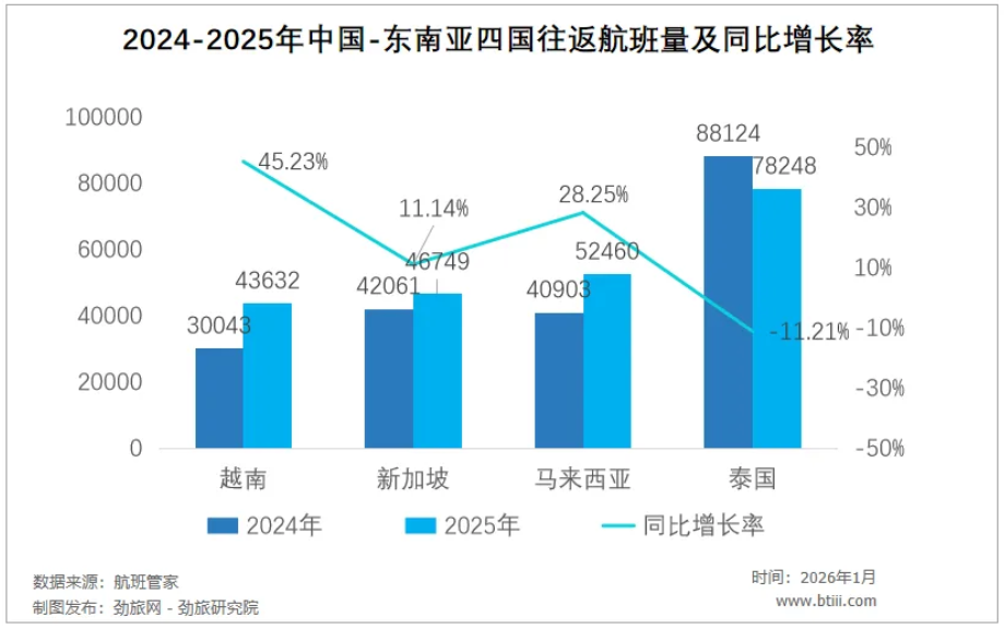 然而2025年中越往返航班量却直线上升,从3万班次猛增至4.3万班次,同比暴涨45.23%,险些追平新加坡(46749班次)、直逼马来西亚(52460班次),与泰国(78248班次)的差距大幅缩小。