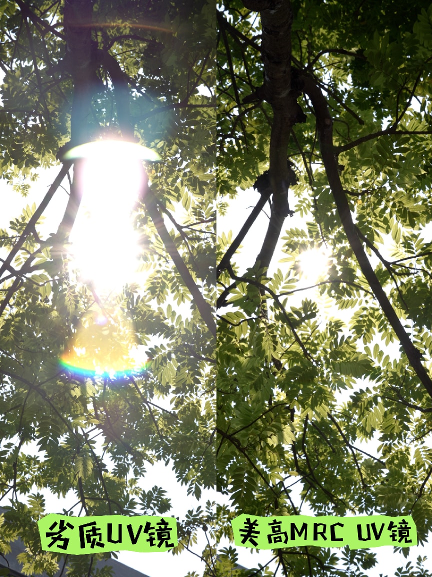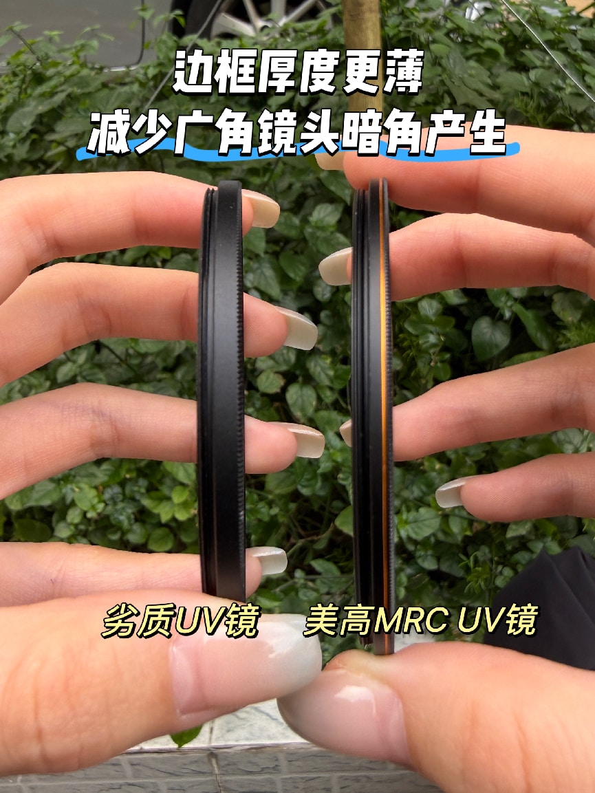 就像我手上这两款对比:右边杂牌UV镜反光刺眼,没镀膜还厚,只能勉强保护镜头,成像出来直接拉胯;左边美高极薄UV镜就完全不一样 —— 厚度比普通款薄一截,多层镀膜加持,水滴上去秒成珠,透光率几乎接近裸镜,逆光拍也没杂光干扰,三防效果拉满!