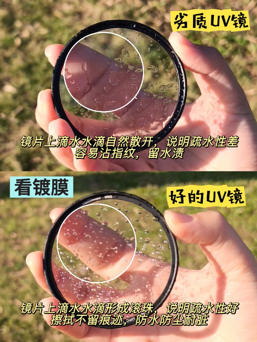 3⃣️ 看镀膜:往镜片上滴一滴水,优质镀膜的UV镜水滴会成珠滚落,防水防尘还耐脏;劣质款水滴直接散开,沾指纹、留水渍,擦都擦不干净。
