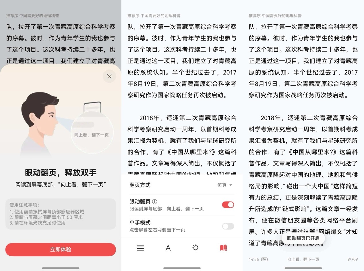 用久了觉得,这功能简直是为我量身定制的。午后的沙发上、冬天钻在被窝里,甚至是地铁上拉着扶手、厨房里切着菜、跑步机上挥着汗……只要有块屏幕,用眼神就能代替手指。眼动翻页不像语音控制那样需要出声,也不像自动翻页那样傻乎乎地按固定时间走,你的阅读节奏都有TA守护。